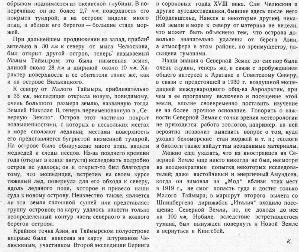 Аналогичная задача представляется также и в восточной половине Полярного океана, где десять лет тому назад к северо-западу от мыса Челюскина была открыта Земля Николая II, берег которой, прослежен с моря лишь на 250 километров. Здесь серьезным вопросом является установить состоит ли эта Земля из одного большого острова или же здесь находится целый архипелаг, а также, где лежит западная граница его.
