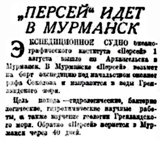Экспедиционное судно океанографического института "Персей" 1 августа вышло из Архангельска в Мурманск. В Мурманске "Персей" возьмет на борт экспедицию под начальством океанографа Соколова и направится в воды Гренландского моря.