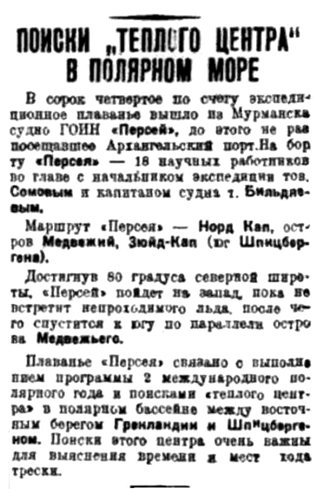 В сорок четвертое по счету экспедиционное плавание вышло из Мурманска судно ГОИН "Персей", до этого не раз посещавшее Архангельский порт. На борту "Персея" — 18 научных работников во главе с начальником экспедиции тов. Сомовым и капитаном судна т. Бильдяевым.