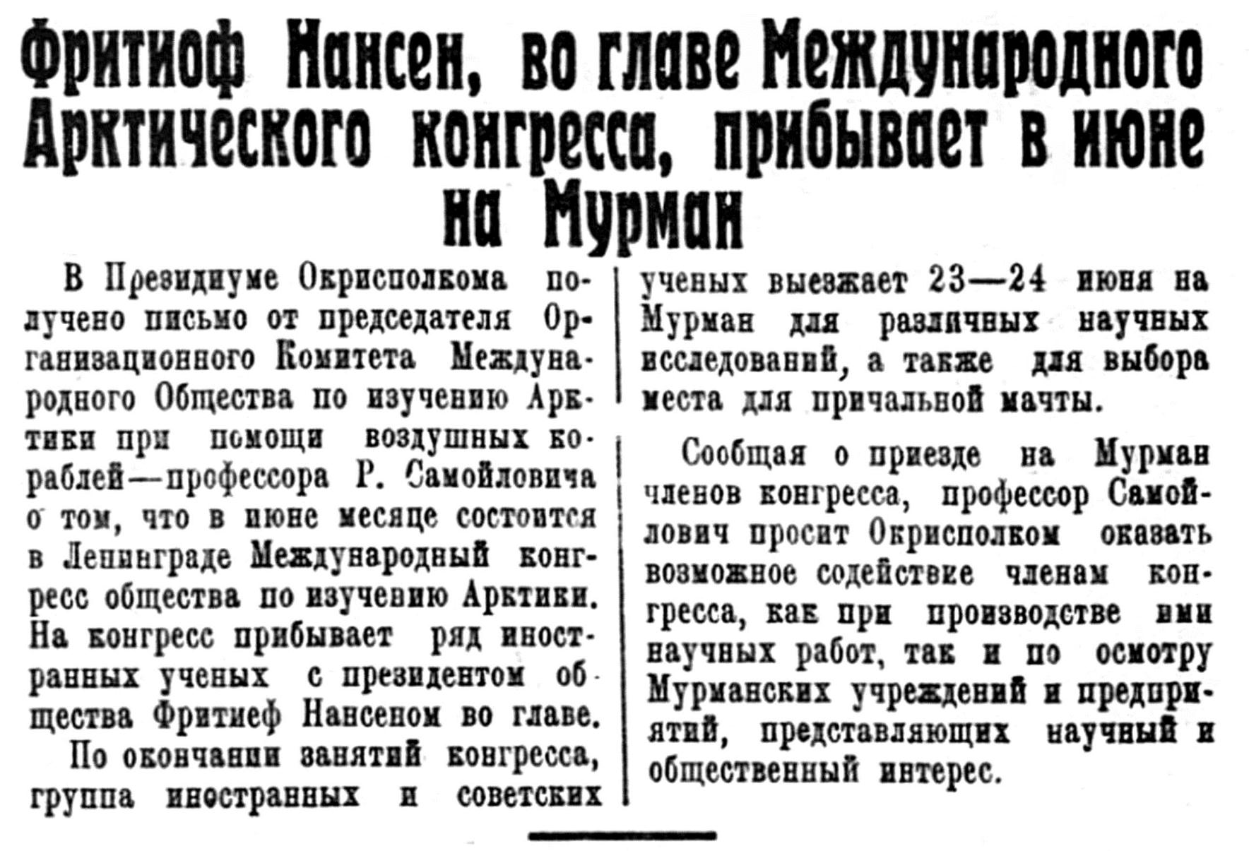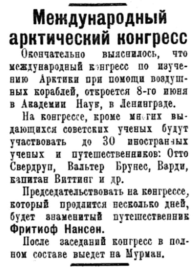 В Ленинграде кончает свою работу второй международный арктический съезд, в котором передовые научные силы СССР принимают активнейшее участив.