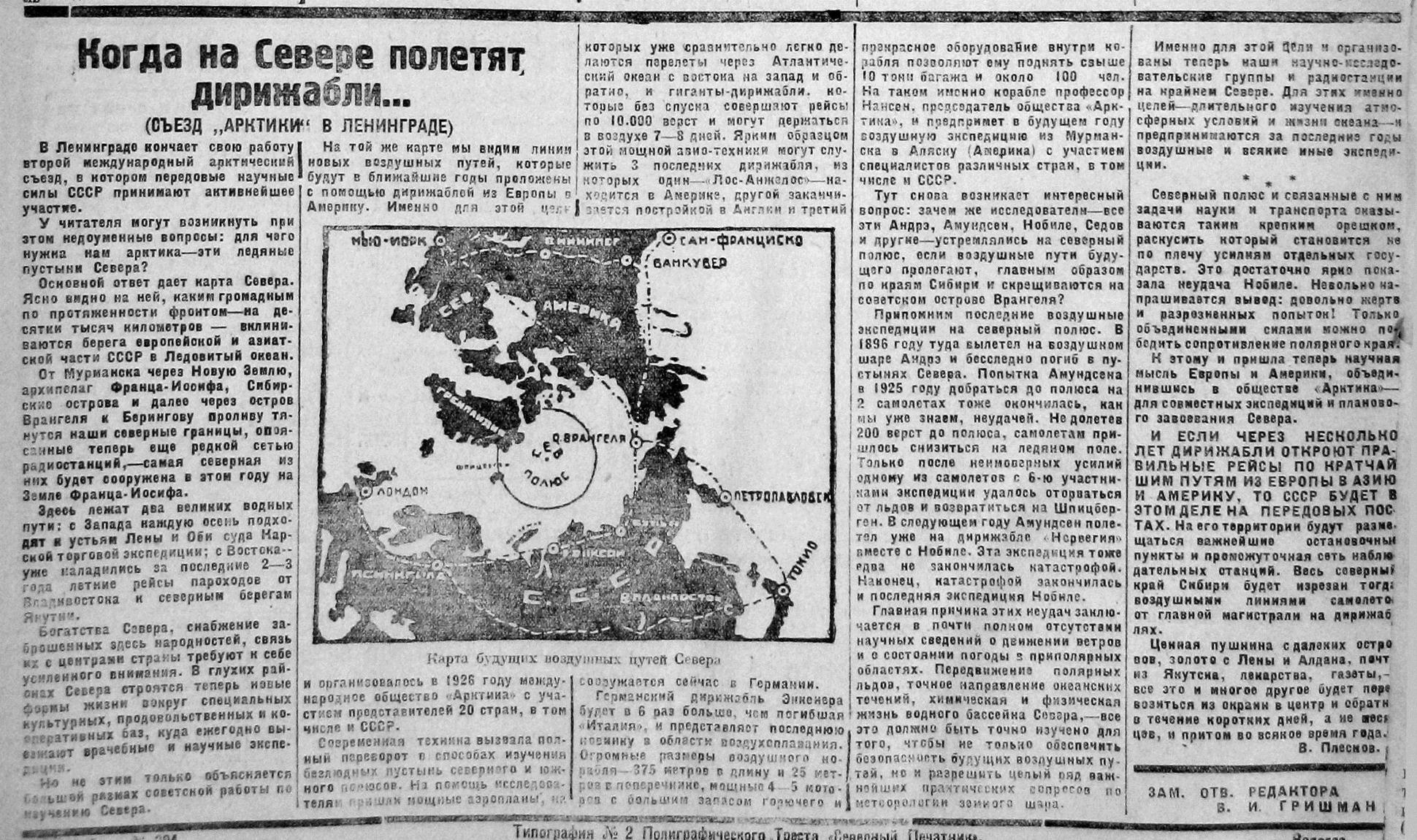 И ЕСЛИ ЧЕРЕЗ НЕСКОЛЬКО ЛЕТ ДИРИЖАБЛИ ОТКРОЮТ ПРАВИЛЬНЫЕ РЕЙСЫ ПО КРАТЧАЙШИМ ПУТЯМ ИЗ ЕВРОПЫ В АЗИЮ И АМЕРИКУ, ТО СССР БУДЕТ В ЭТОМ ДЕЛЕ НА ПЕРЕДОВЫХ ПОСТАХ. На его территории будут размещаться важнейшие оетановочные пункты и промежуточная сеть наблюдательных станций. Весь соверный край Сибири будет изрезан тогда воздушными линиями самолетов от главной магистрали на дирижаблях.