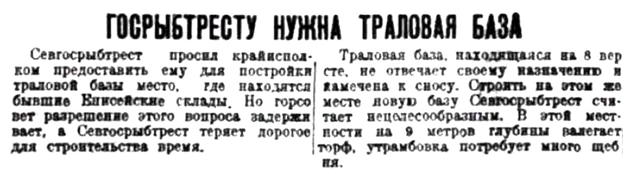 Севгосрыбтрест просил крайисполком предоставить ему для постройки траловой базы место, где находятся бывшие Енисейские склады. Но горсовет разрешение этого вопроса задерживает, а Севгосрыбтрест теряет дорогое для строительства время.