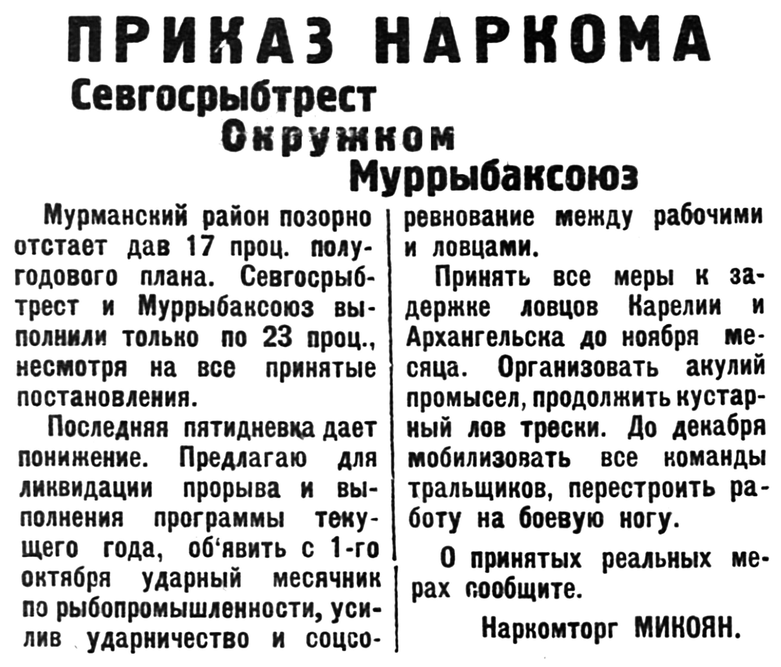 Полярная Правда, 1930, №108, 3 октября приказ наркома Микояна.jpg