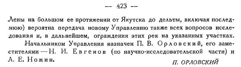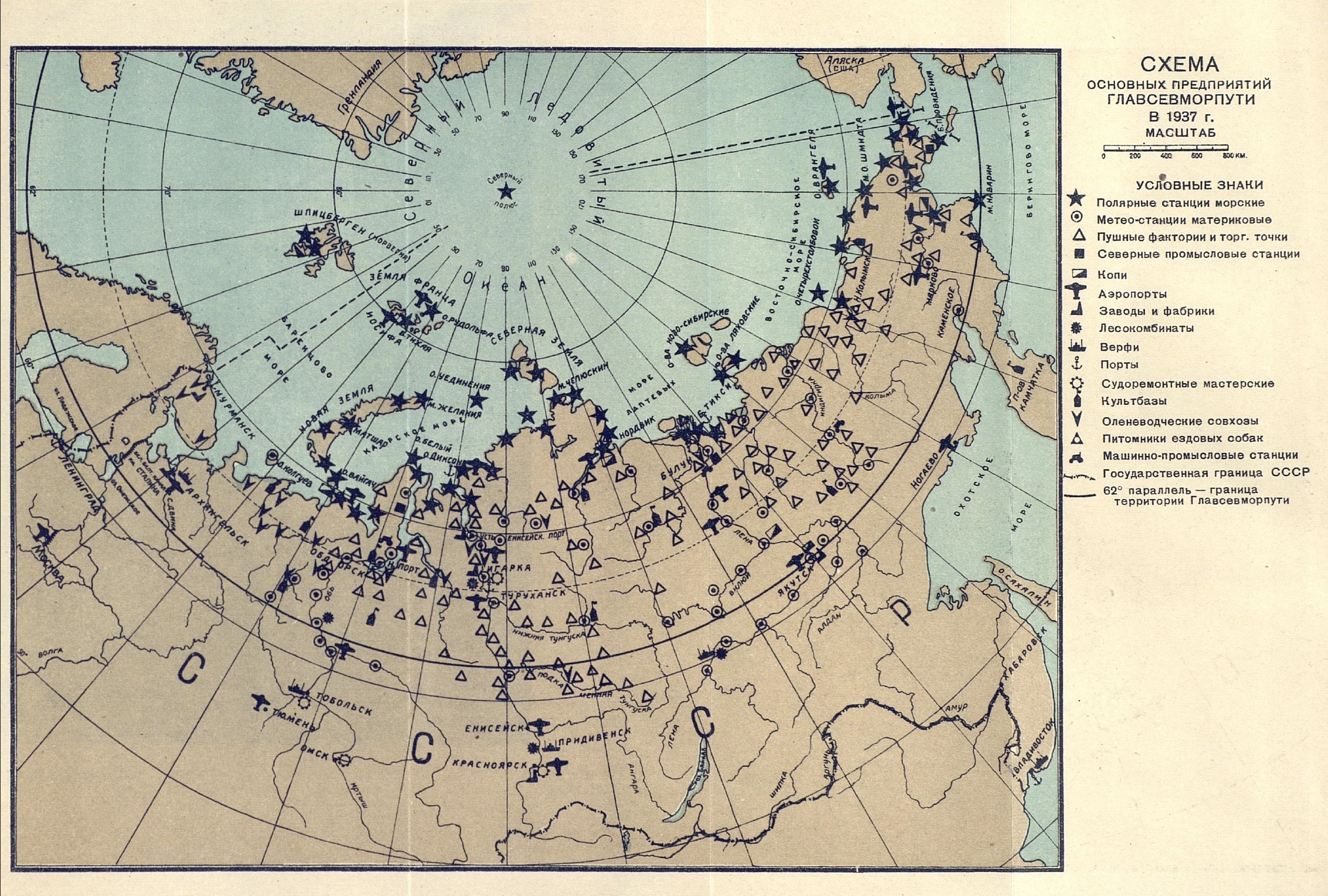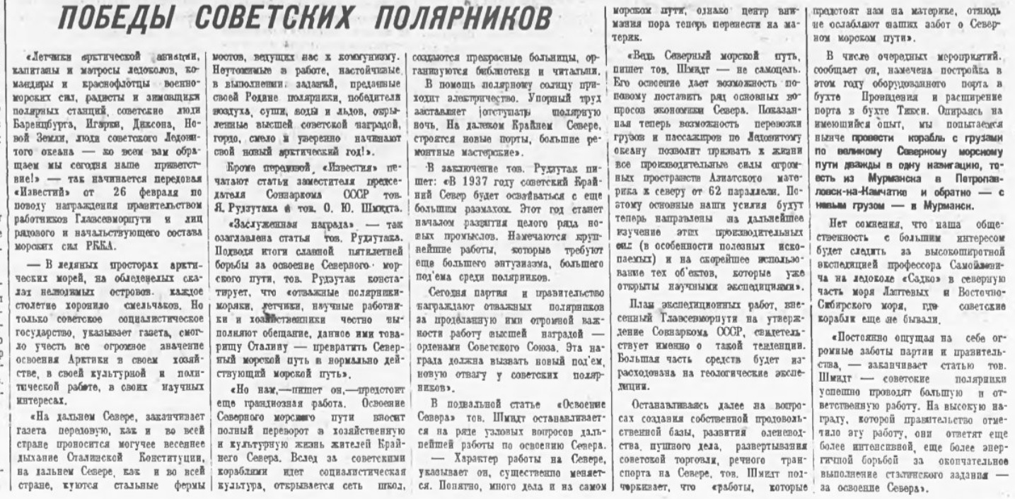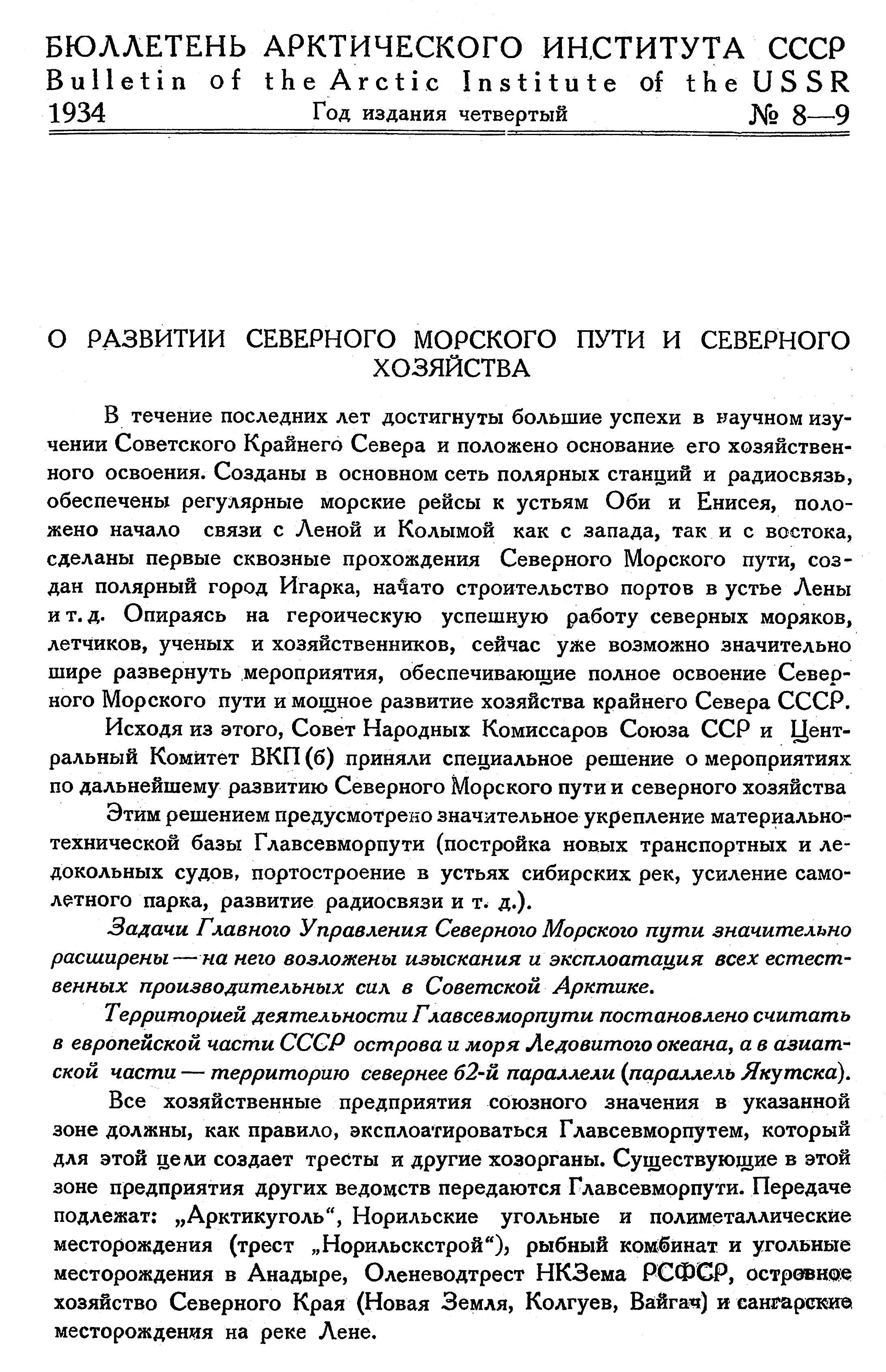 В течение последних лет достигнуты большие успехи в научном изучении Советского Крайнего Севера и положено основание его хозяйственного освоения. Созданы в основном сеть полярных станций и радиосвязь, обеспечены регулярные морские рейсы к устьям Оби и Енисея, положено начало связи с Леной и Колымой как с запада, так и с востока, сделаны первые сквозные прохождения Северного Морского пути, создан полярный город Игарка, начато строительство портов в устье Лены и т. д. Опираясь на героическую успешную работу северных моряков, летчиков, ученых и хозяйственников, сейчас уже возможно значительно шире развернуть мероприятия, обеспечивающие полное освоение Северного Морского пути и мощное развитие хозяйства крайнего Севера СССР.