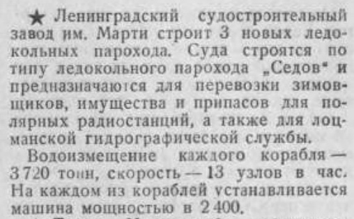 Все ледокольное хозяйство постановлено объединить в Главсевморпути и передать ему от Наркомвода следующие ледоколы: „Красин", „Ермак", „Ленин", „Добрыня Никитич", „Макаров", „Давыдов", „Литке", „Малыгин", „Русанов" и „Трувор". Главсевморпуть должен обеспечить правильную расстановку ледоколов в зависимости от их мощности и особенностей как по участкам Северного Морского пути, так и по портам с тем, чтобы ледоколы, выделенные в порты Ленинграда, Владивостока, Черного и Азовского морей, эксплоатировались портами на началах аренды.