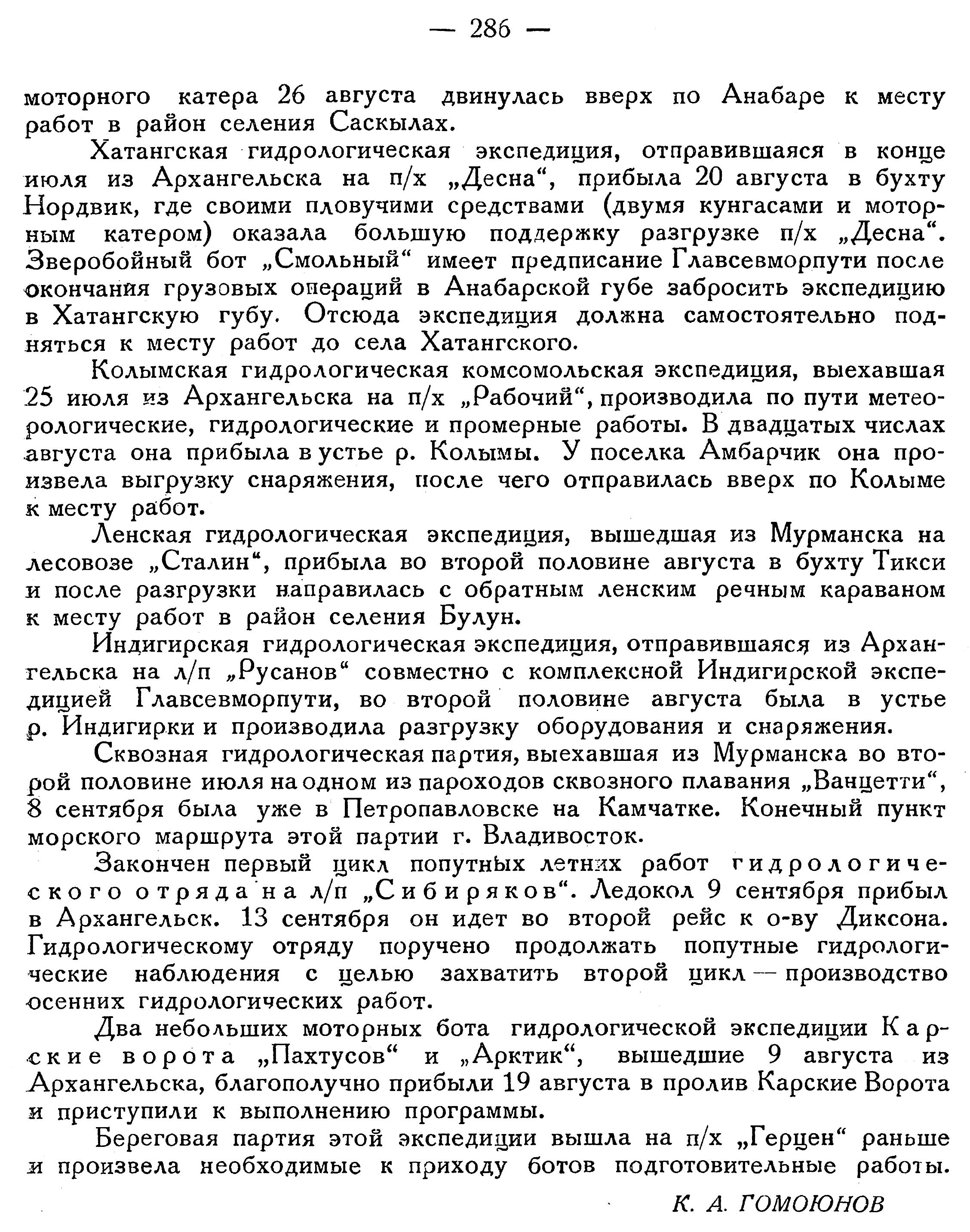 Ленская гидрологическая экспедиция, вышедшая из Мурманска на лесовозе „Сталин", прибыла во второй половине августа в бухту Тикси и после разгрузки направилась с обратным ленским речным караваном к месту работ в район селения Булун.