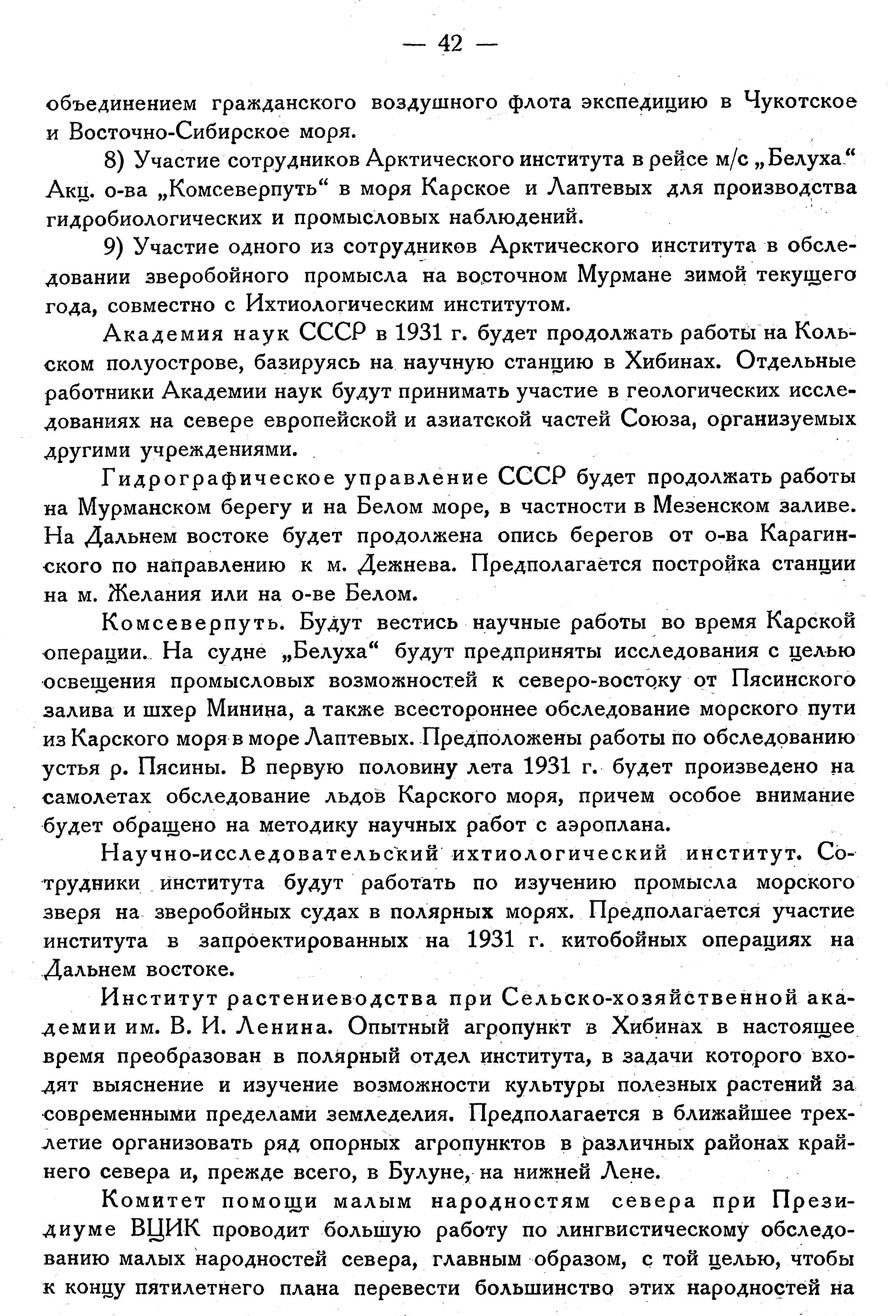 Комсеверпуть. Будут вестись научные работы во время Карской операции. На судне „Белуха“ будут предприняты исследования с целью освещения промысловых возможностей к северо-востоку от Пясинского залива и шхер Минина, а также всестороннее обследование морского пути из Карского моря в море Лаптевых. Предположены работы по обследованию устья р. Пясины. В первую половину лета 1931 г. будет произведено на самолетах обследование льдов Карского моря, причем особое внимание будет обращено на методику научных работ с аэроплана.