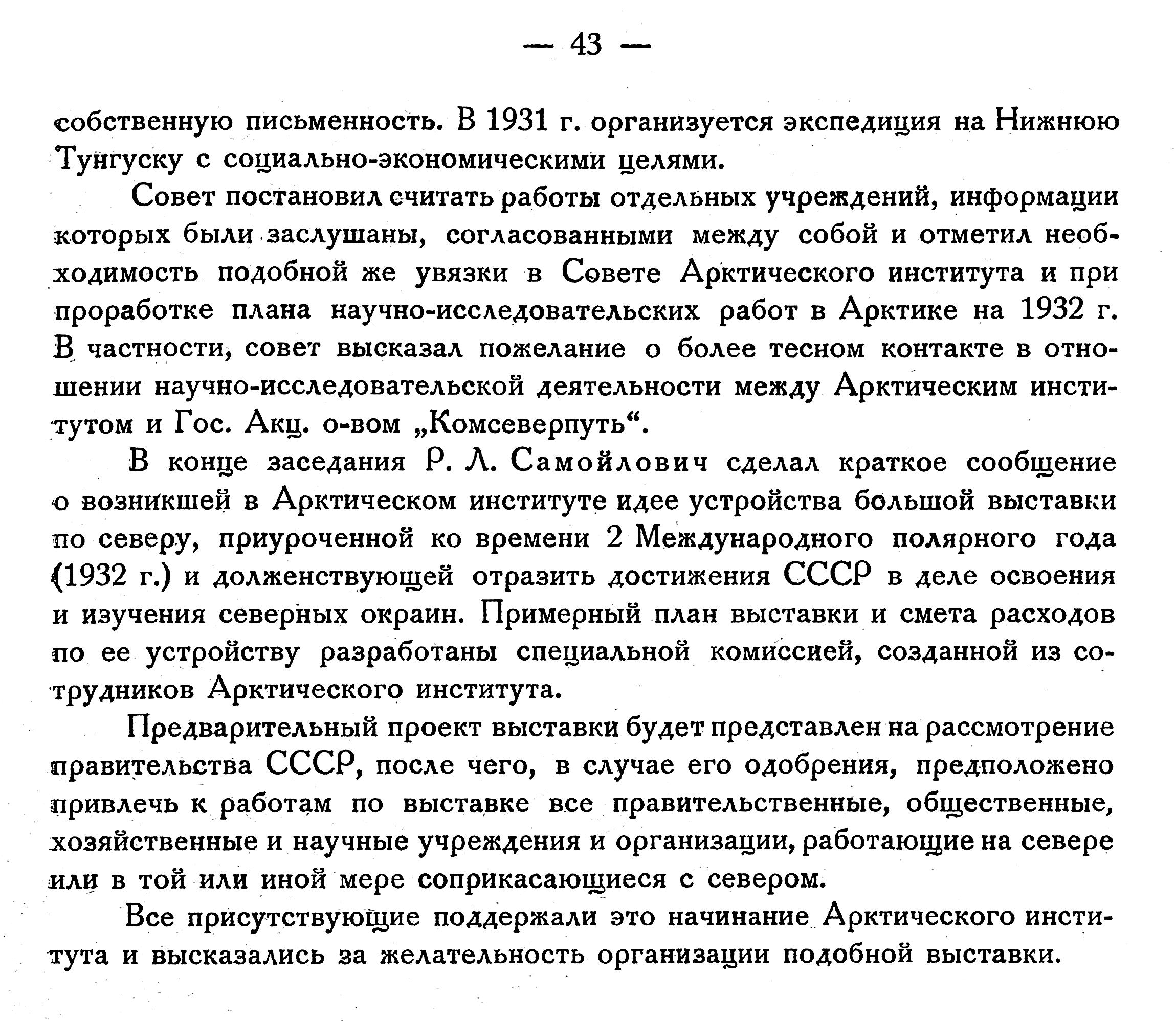Совет постановил считать работы отдельных учреждений, информации которых были заслушаны, согласованными между собой и отметил необходимость подобной же увязки в Совете Арктического института и при проработке плана научно-исследовательских работ в Арктике на 1932 г. В частности, совет высказал пожелание о более тесном контакте в отношении научно-исследовательской деятельности между Арктическим институтом и Гос. Акц. о-вом „Комсеверпуть".