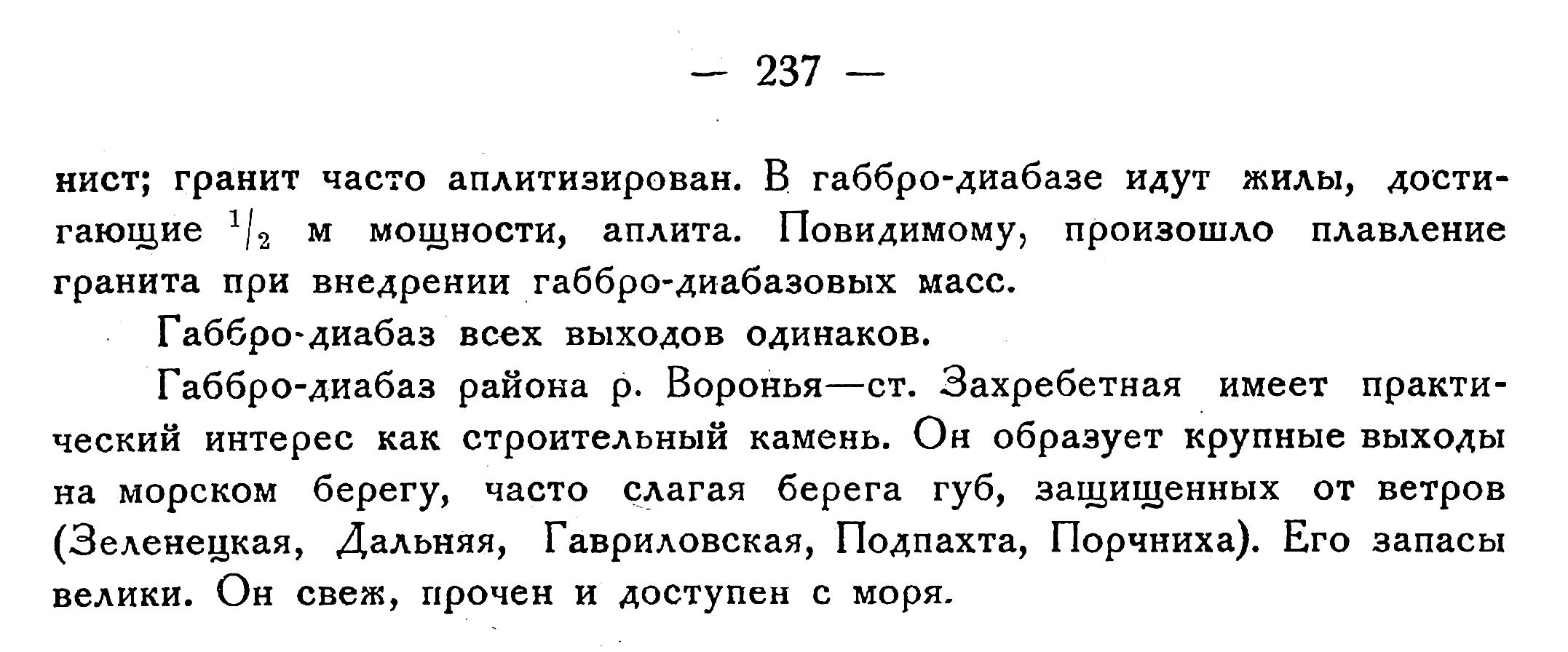 нист; гранит часто аплитизирован. В габбро-диабазе идут жилы, достигающие 1/2 м мощности, аплита. Повидимому, произошло плавление гранита при внедрении габбро-диабазовых масс.