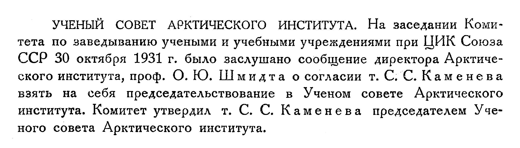 УЧЕНЫЙ СОВЕТ АРКТИЧЕСКОГО ИНСТИТУТА. На заседании Комитета по заведыванию учеными и учебными учреждениями при ЦИК Союза ССР 30 октября 1931 г. было заслушано сообщение директора Арктического института, проф. О. Ю. Шмидта о согласии т. С. С. Каменева взять на себя председательствование в Ученом совете Арктического института. Комитет утвердил т. С. С. Каменева председателем Ученого совета Арктического института.