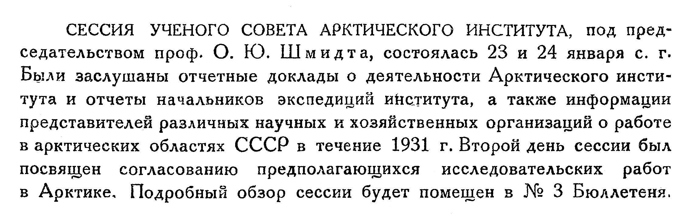 СЕССИЯ УЧЕНОГО СОВЕТА АРКТИЧЕСКОГО ИНСТИТУТА, под председательством проф. О. Ю. Шмидта, состоялась 23 и 24 января с. г. Были заслушаны отчетные доклады о деятельности Арктического института и отчеты начальников экспедиций института, а также информации представителей различных научных и хозяйственных организаций о работе в арктических областях СССР в течение 1931 г. Второй день сессии был посвящен согласованию предполагающихся исследовательских работ в Арктике, Подробный обзор сессии будет помещен в № 3 Бюллетеня.