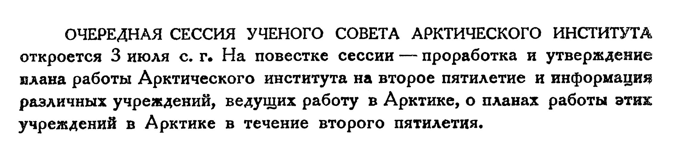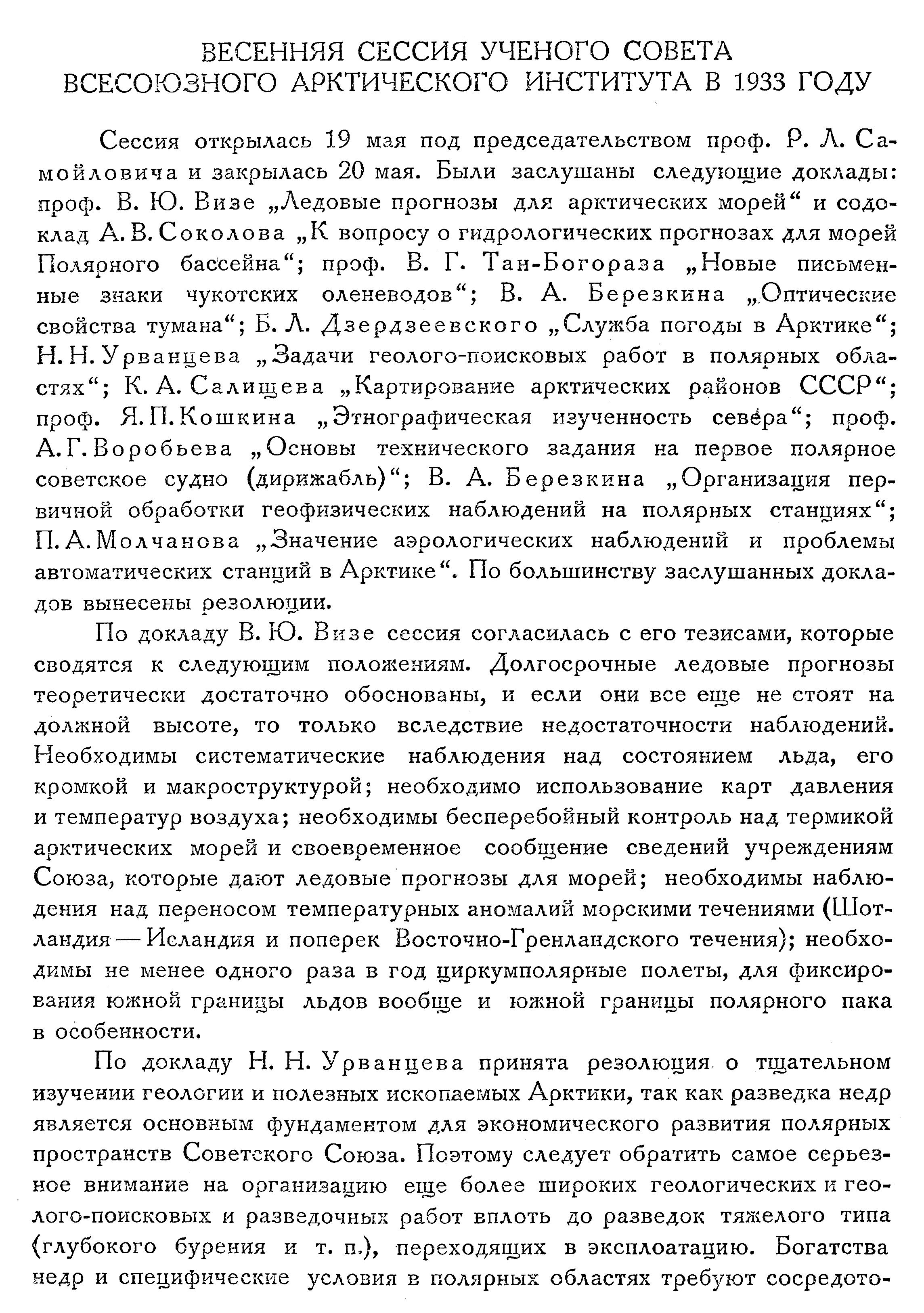 ВЕСЕННЯЯ СЕССИЯ УЧЕНОГО СОВЕТА ВСЕСОЮЗНОГО АРКТИЧЕСКОГО ИНСТИТУТА В 1933 ГОДУ