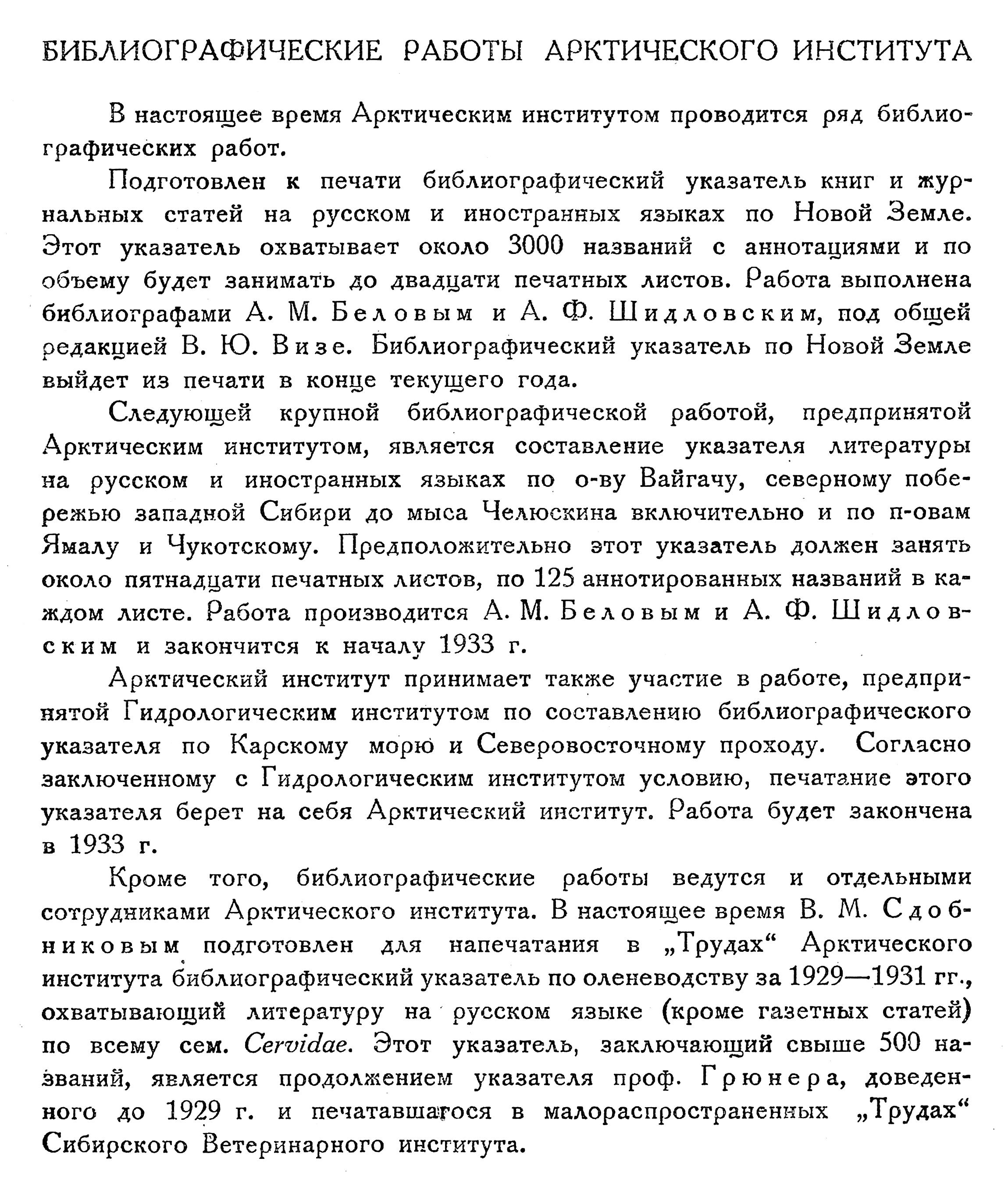 Следующей крупной библиографической работой, предпринятой Арктическим институтом, является составление указателя литературы на русском и иностранных языках по о-ву Вайгачу, северному побережью западной Сибири до мыса Челюскина включительно и по п-овам Ямалу и Чукотскому. Предположительно этот указатель должен занять около пятнадцати печатных листов, по 125 аннотированных названий в каждом листе. Работа производится А. М. Беловым и А. Ф. Шидловским и закончится к началу 1933 г.