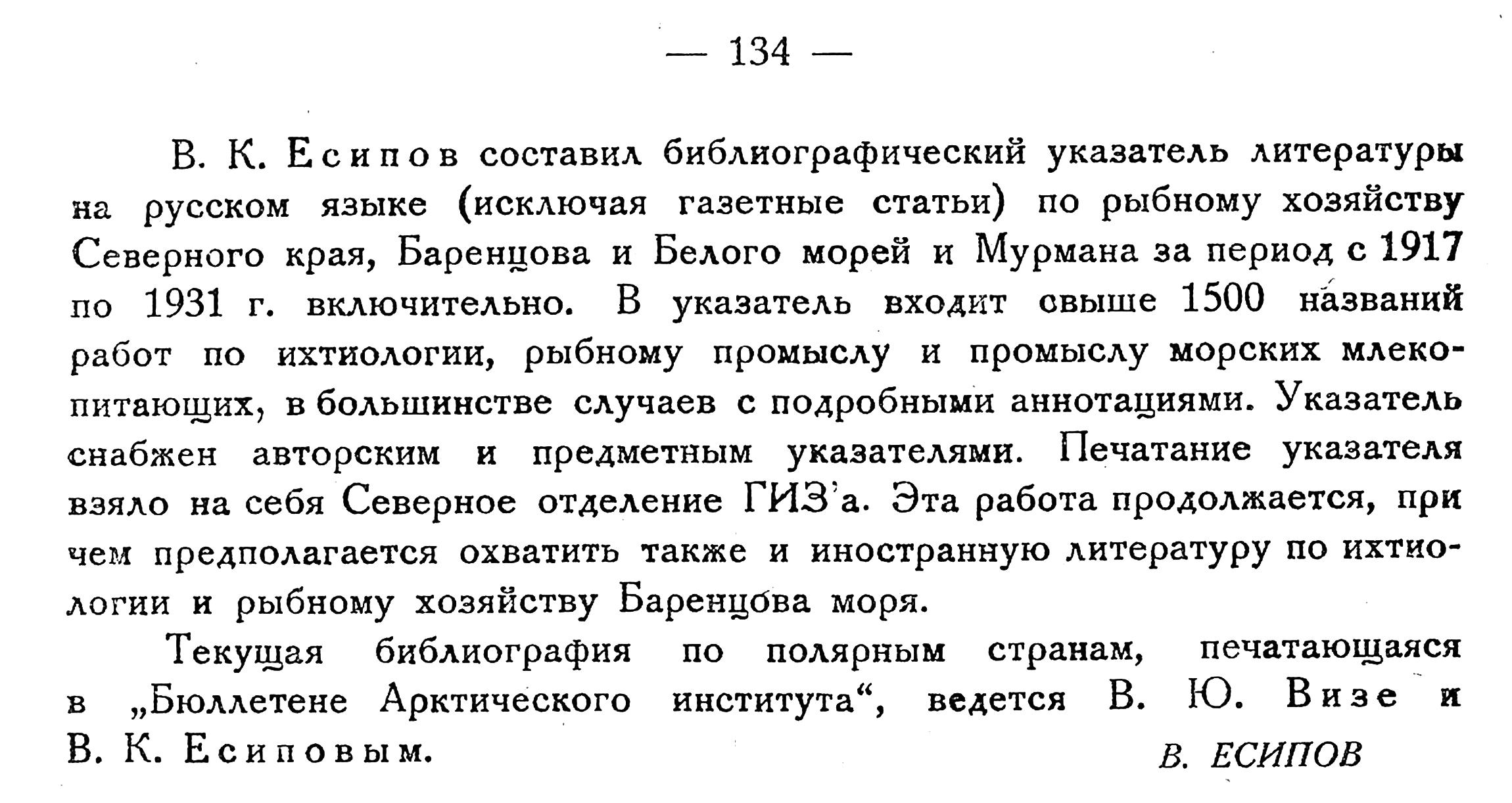 В. К. Есипов составил библиографический указатель литературы на русском языке (исключая газетные статьи) по рыбному хозяйству Северного края, Баренцова и Белого морей и Мурмана за период с 1917 по 1931 г. включительно. В указатель входит свыше 1500 названий работ по ихтиологии, рыбному промыслу и промыслу морских млекопитающих, в большинстве случаев с подробными аннотациями. Указатель снабжен авторским и предметным указателями. Печатание указателя взяло на себя Северное отделение ГИЗ'а. Эта работа продолжается, при чем предполагается охватить также и иностранную литературу по ихтиологии и рыбному хозяйству Баренцова моря.