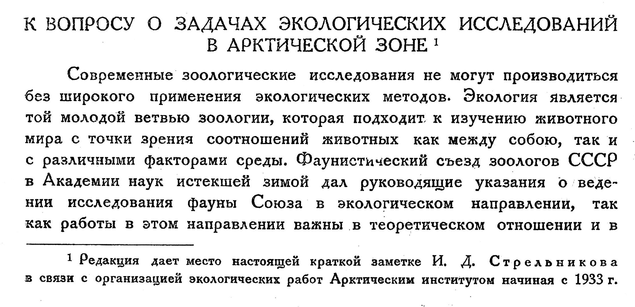 1) Редакция дает место настоящей краткой заметке И. Д. Стрельникова в связи с организацией экологических работ Арктическим институтом начиная с 1933 г.