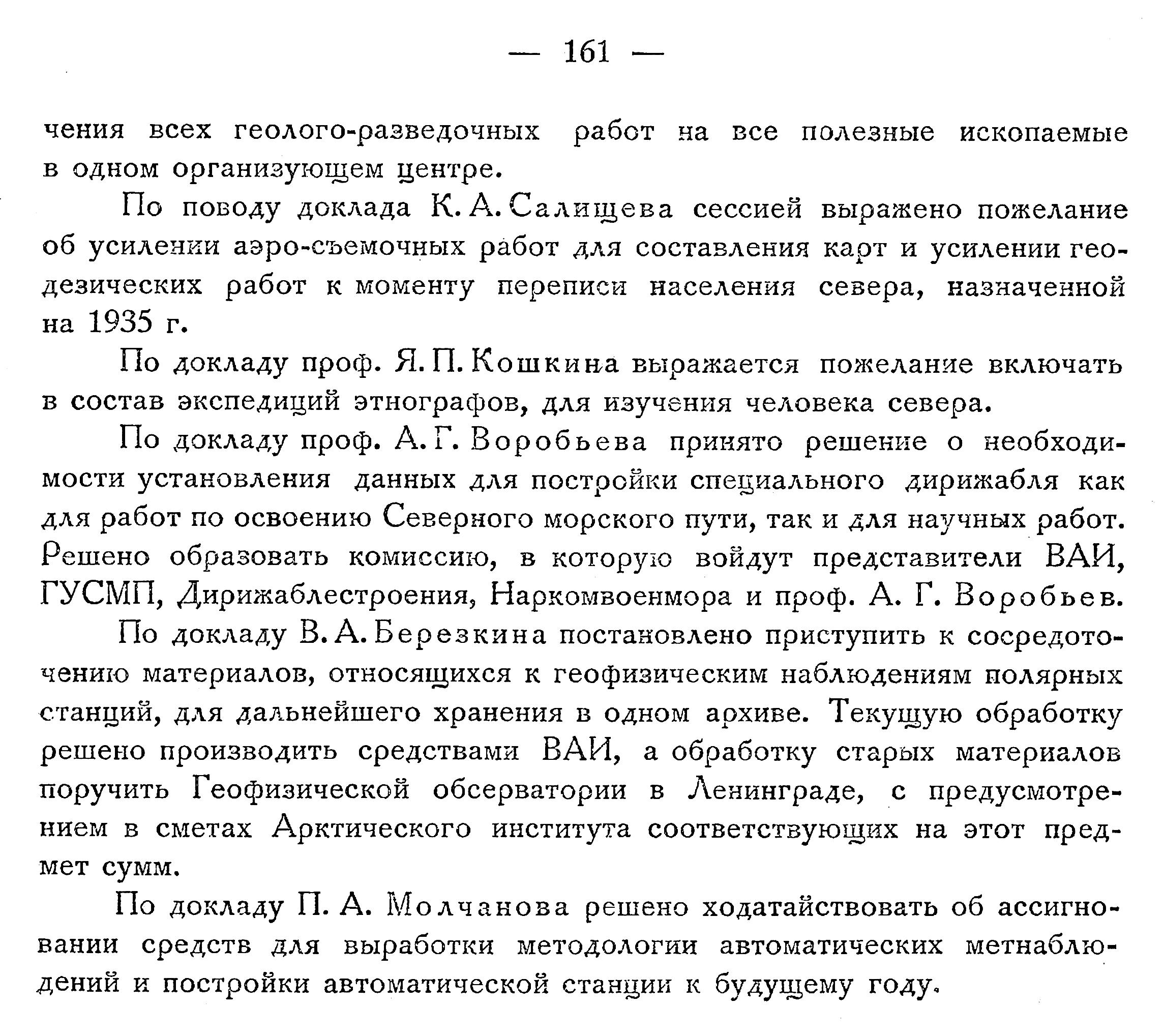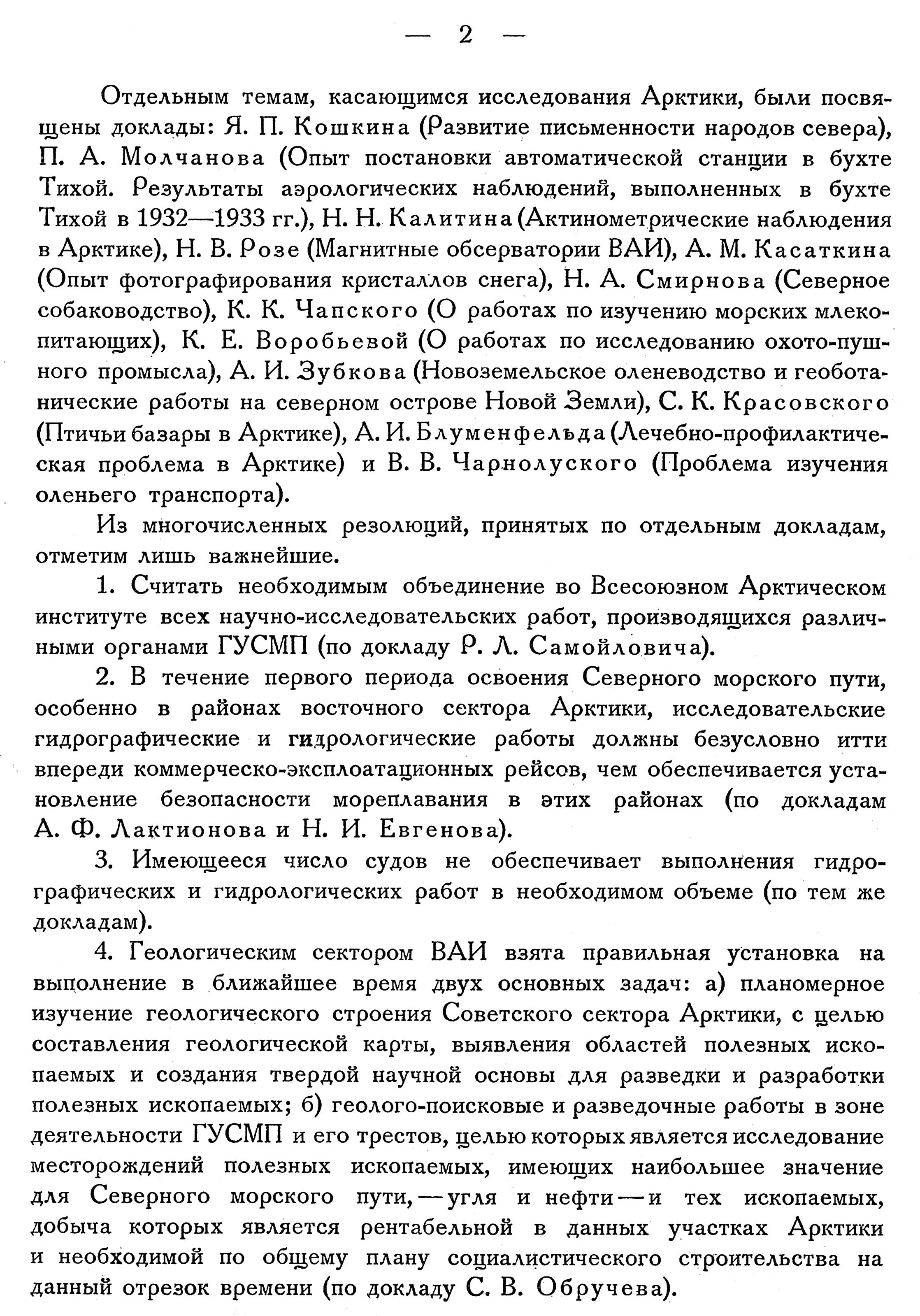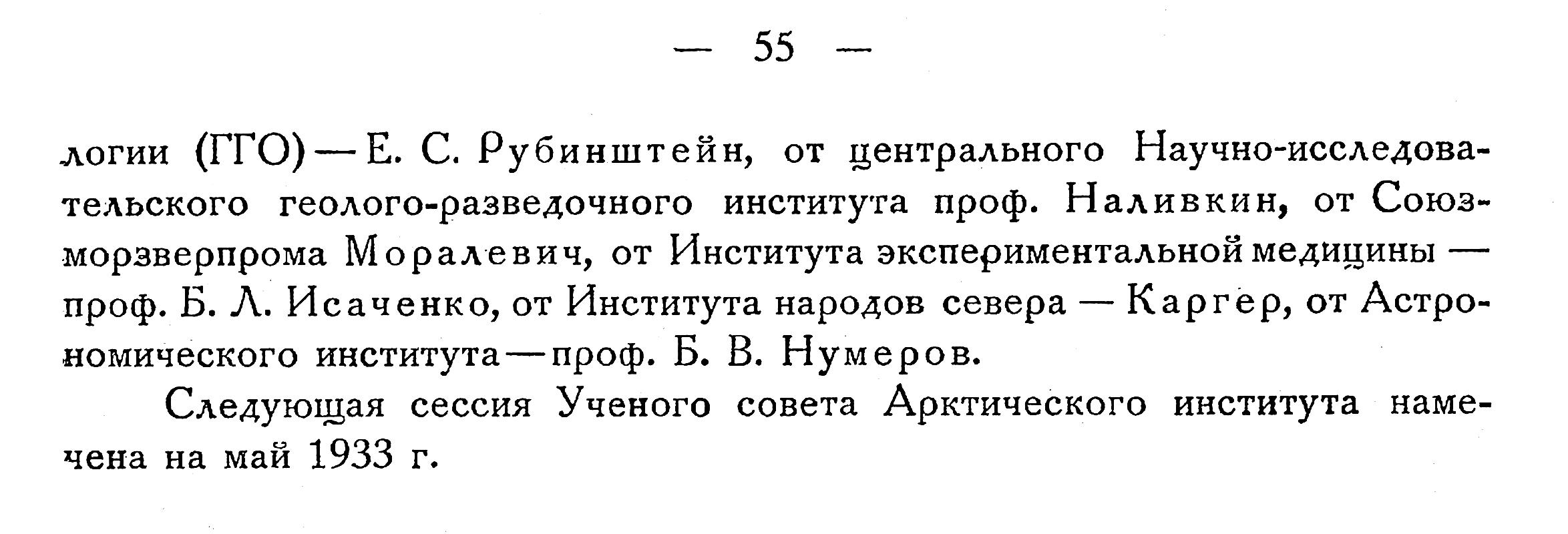 В дальнейшем был заслушан ряд информационных докладов о научно-исследовательских работах и хозяйственных мероприятиях в Арктике в 1932 г. и о плане работ на 1933 год. От Арктического института выступили проф. В. Ю. Визе и проф. Р. Л. Самойлович, от Комитета по проведению Второго международного полярного года проф. H. Н. Зубов, от Полярной Комиссии Академии Наук СССР проф. А. И. Толмачев, от Комсеверпути Б. В. Лавров, от Гидрометеорологического Комитета СССР А. В. Соколов, от Гидрографического Управления А. М. Лавров, от Института земного магнетизма проф. Н. В. Розе, от Гос. Гидрологического института проф. К. М. Дерюгин и С. И. Каплан, от Океанографического института — С. Я. Миттельман, от Института климатологии (ГГО) — Е. С. Рубинштейн, от центрального Научно-исследовательского Геолого-разведочного института проф. Наливкин, от Союзморзверпрома Moралевич, от Института экспериментальной медицины — проф. Б. Л. Исаченко, от Института народов севера — Каргер, от Астрономического института — проф. Б. В. Нумеров.