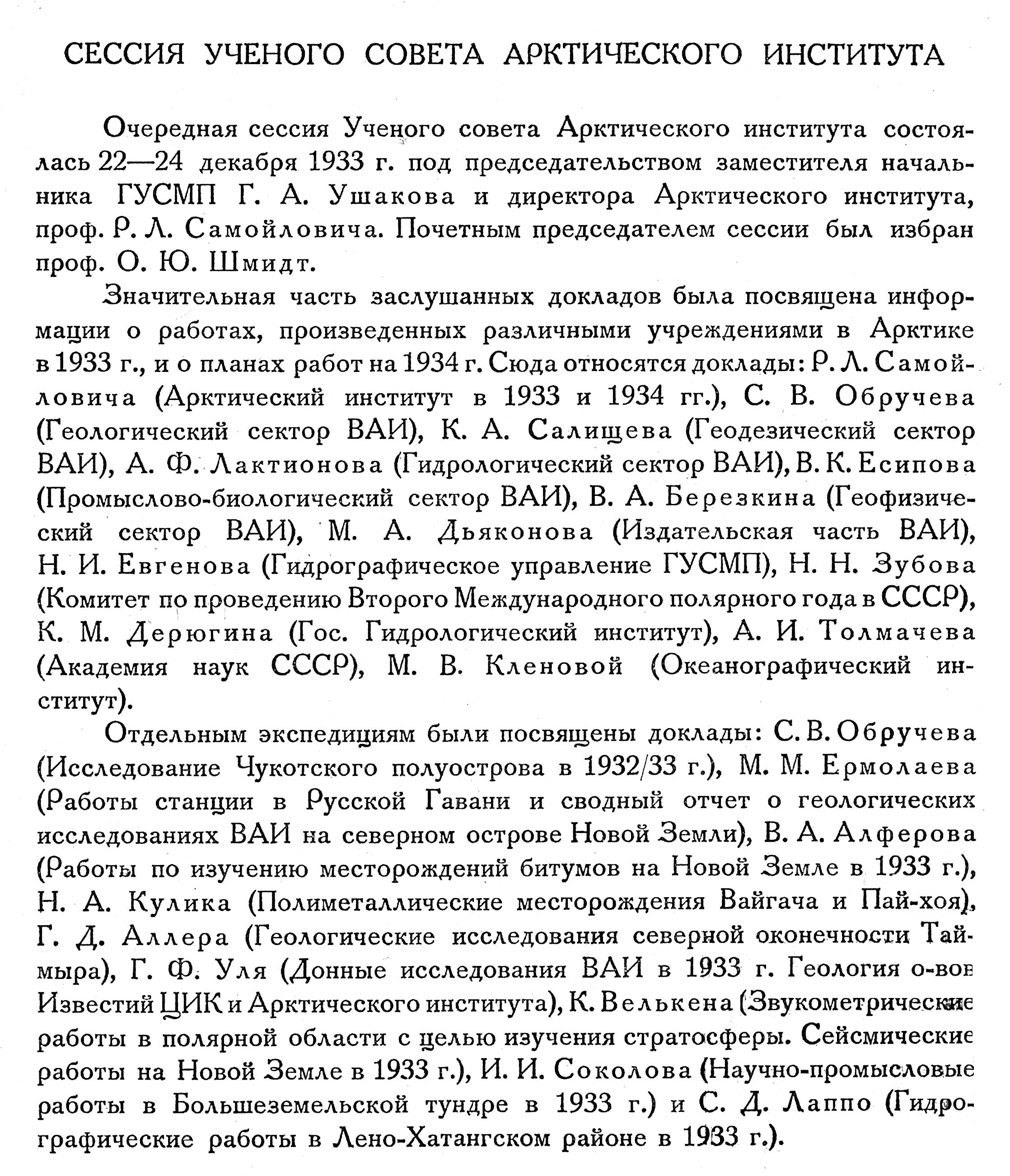 Очередная сессия Ученого совета Арктического института состоялась 22—24 декабря 1933 г. под председательством заместителя начальника ГУСМП Г. А. Ушакова и директора Арктического института, проф. Р. Л. Самойловича. Почетным председателем сессии был избран проф. О. Ю. Шмидт.