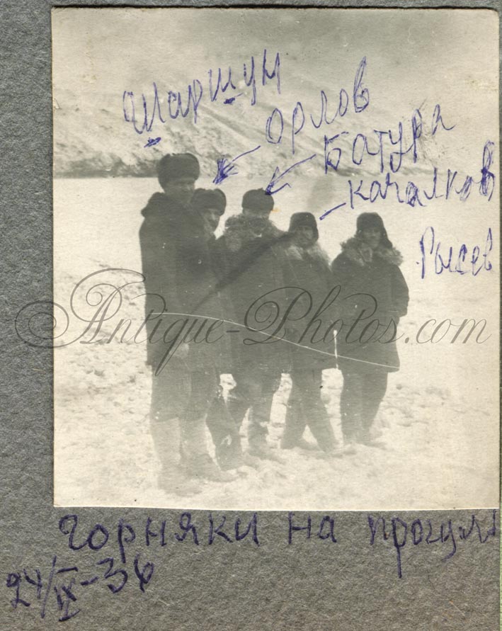 Фото № 47. "Горняки на прогулке, 24/IX-36". Фамилии запечатленных людей указаны: Шаршун, Орлов, Батура, Качалков, Рысев.