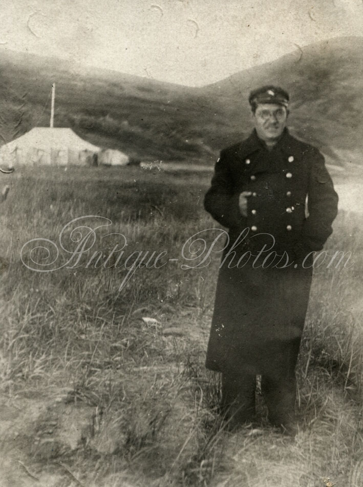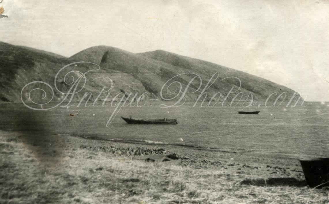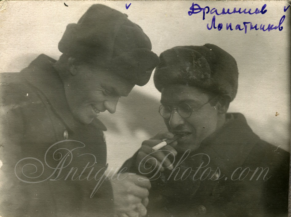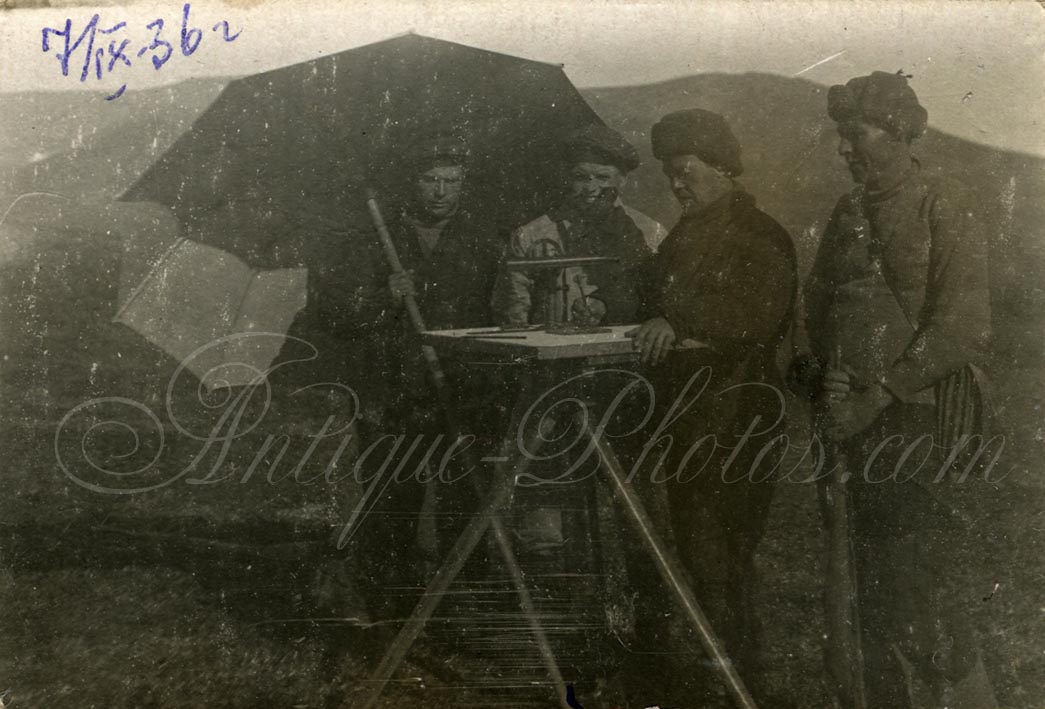 На реверсе чуть более подробная надпись: "24/IX-36. Бухта Угольная, Чукотка. Горняки на прогулке в выходной день на берегу Берингова моря. Слева направо: Шаршун, Орлов, Батура, Кочалков, Рысев".