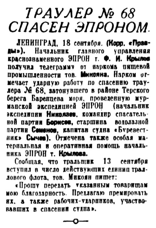 ЛЕНИНГРАД, 18 сентября. (Корр. "Правды"). Начальник главного управления краснознаменного ЭПРОН т. Ф. И. Крылов получил телеграмму от наркома пищевой промышленности тов. Микояна. Нарком отмечает ударную работу по спасению траулера № 68, затонувшего в районе Терского берега Баренцева моря, проведенную мурманской экспедицией ЭПРОН (начальник экспедиции Николаев, командир спасательной партии Борисов, старшина водолазной партии Семенов, капитан судна "Буревестник" Сычов). Отмечена также особая материальная и оперативная помощь начальника ЭПРОН т. Крылова.