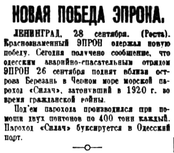 ЛЕНИНГРАД, 28 сентября. (Роста). Краснознаменный ЭПРОН одержал новую победу. Сегодня получено сообщение, что одесской аварийно-спасательным отрядом ЭПРОН 26 сентября поднят вблизи острова Березань в Черном море морской пароход "Силач", затонувший в 1920 г. во время гражданской войны.