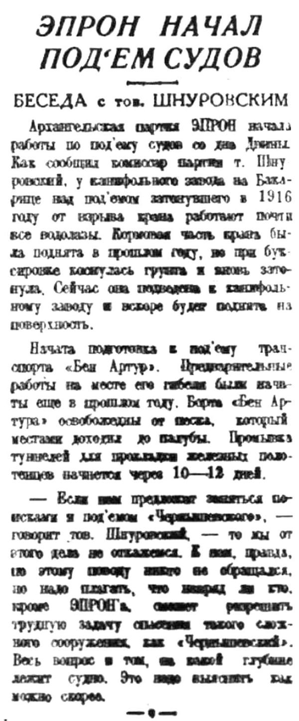 Архангельская партия ЭПРОН начала работы по подъему судов со дна Двины. Как сообщил комиссар партии т. Шнуровский, у канифольного завода на Бакарице над подъемом затонувшего в 1916 году от взрыва крана работают почти все водолазы. Кормовая часть крана была поднята в прошлом году, но при буксировке коснулась грунта и вновь затонула. Сейчас она подведена к канифольному заводу и вскоре будет поднята на поверхность.