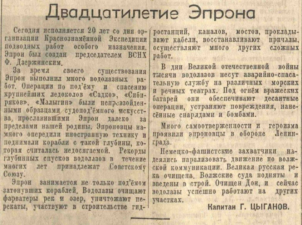 Капитан Цыганов Г. Двадцатилетие Эпрона// Красный флот, 17 декабря, 1943, № 297 (1555)