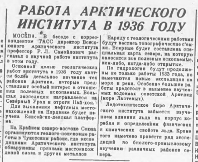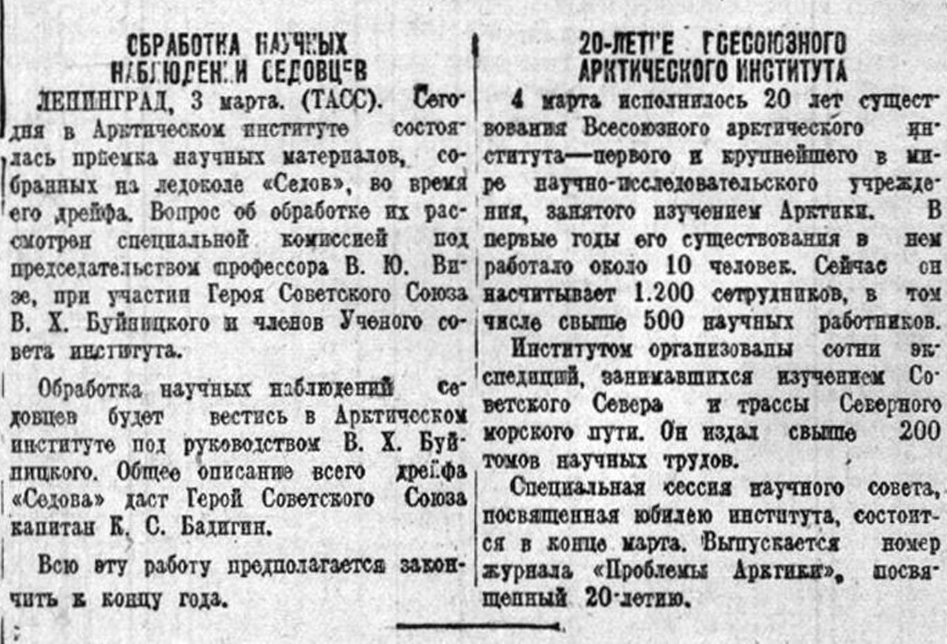 4 марта исполнилось 20 лет существования Всесоюзного арктического института — первого и крупнейшего в мире научно-исследовательского учреждения, занятого изучением Арктики. В первые годы его существования в нем работало около 10 человек. Сейчас он насчитывает 1.200 сотрудников, в том числе свыше 500 научных работников. Институтом организованы сотни экспедиций, занимавшихся изучением Советского Севера и трассы Северного морского пути. Он издал свыше 200 томов научных трудов.