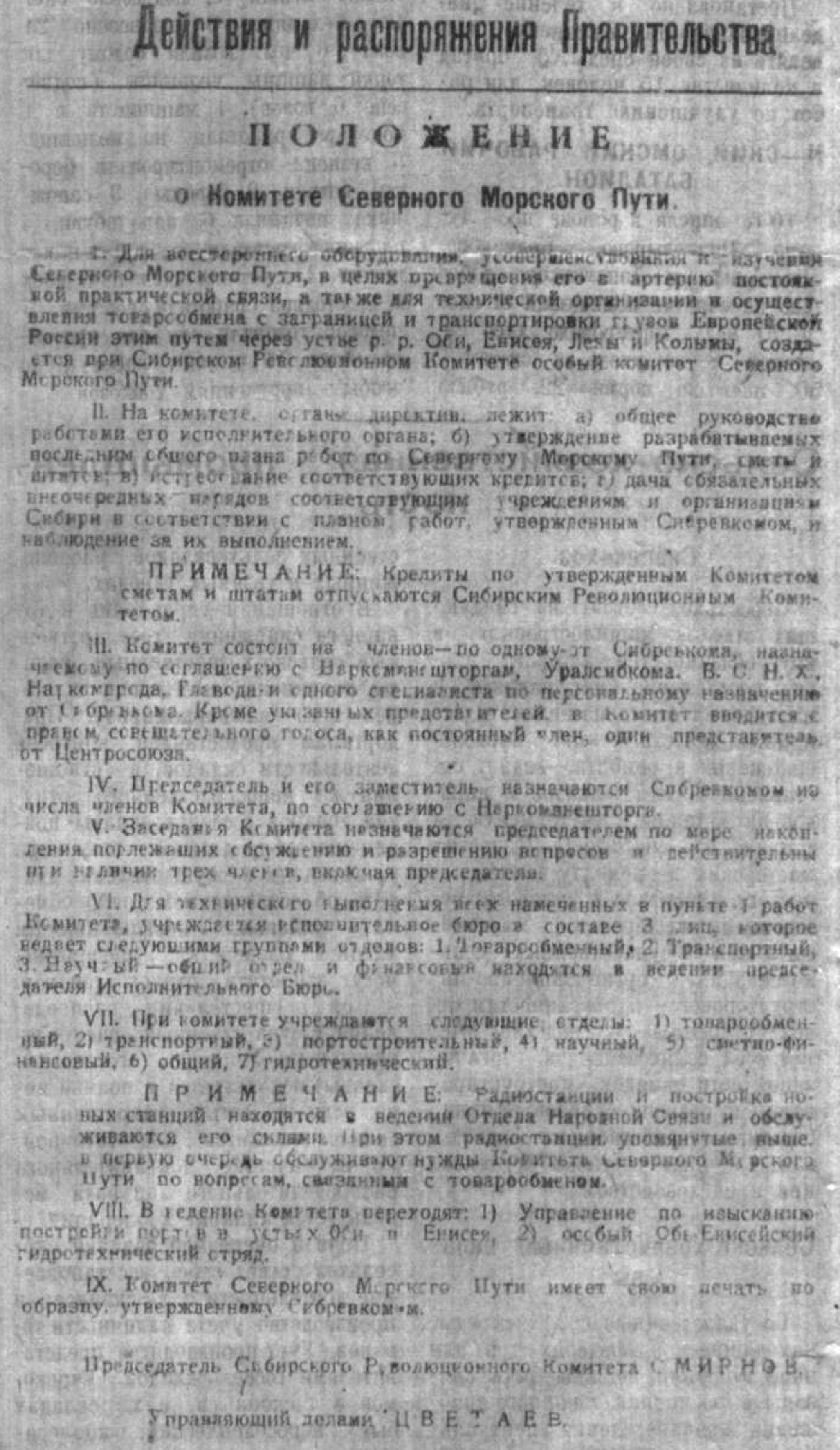 Даже, при настоящих тяжелых условиях народного хозяйства Республики, результаты работ Комсеверпути и его экспедиций, не могут быть не отмечены, как явление, заслуживающее особого внимания, не только в экономической жизни Севера, но и Сибири вообще. Комитет в его новой конструкции насчитывает лишь 14 месяцев своего существования; тем не менее его работы уже успели пустить глубокие корни в бытовую и хозяйственную жизнь Сибири, и привлечь местное население к проявлению живого интереса к целям, преследуемым Комитетом. (Так, наприм. И. Я. Чупров в Обдорское предложил организовать разведочно-промышленную экспедицию по ловле морского зверя в Карском море. К. В. Пуссе в Дудинке, по поручению Комитета, явился организатором заготовки и перевозки леса в Норильском районе, упомянутый выше Н. В. Бегичев предпринял розыски спутников Амундсена и пр.)
