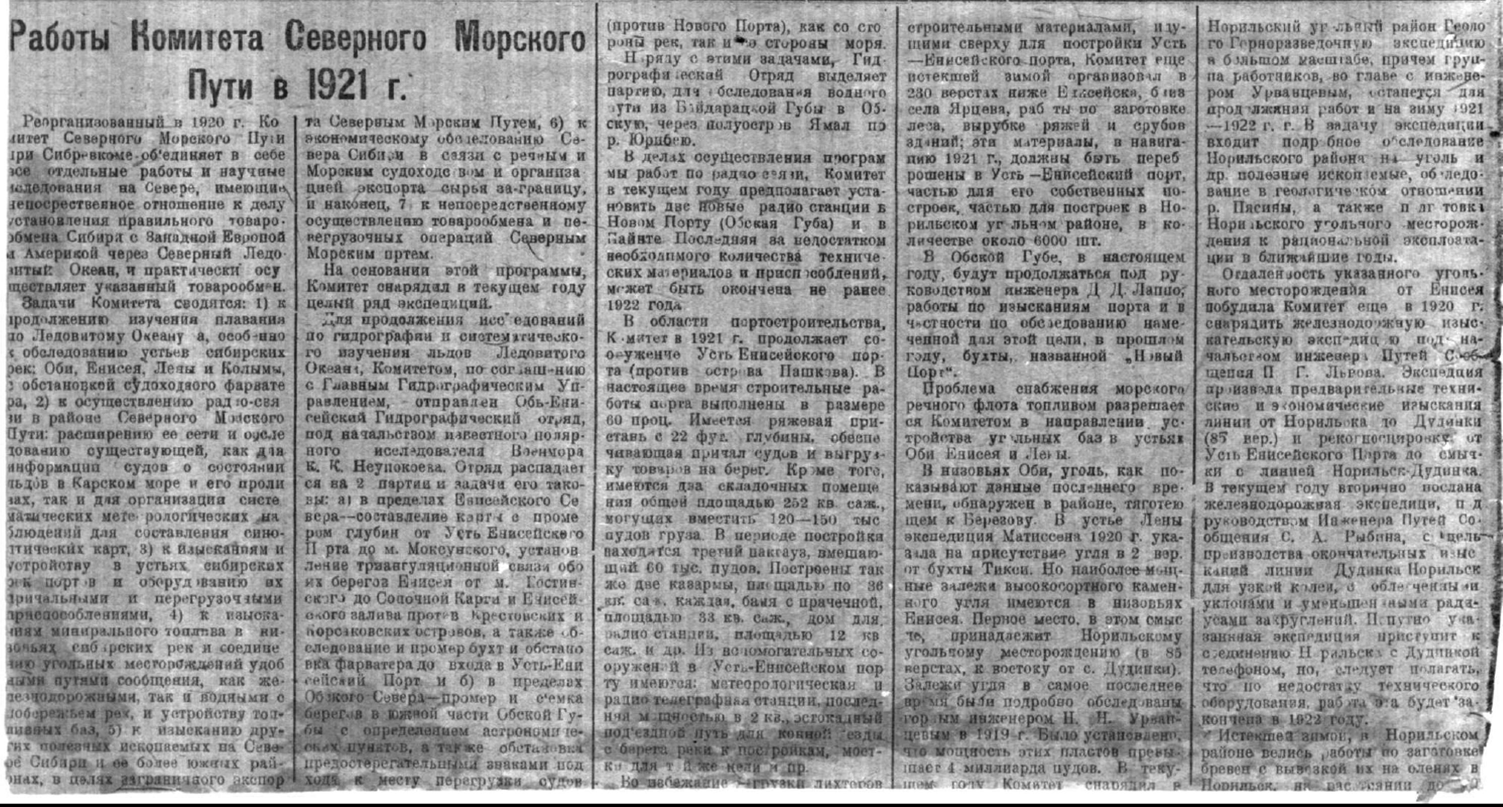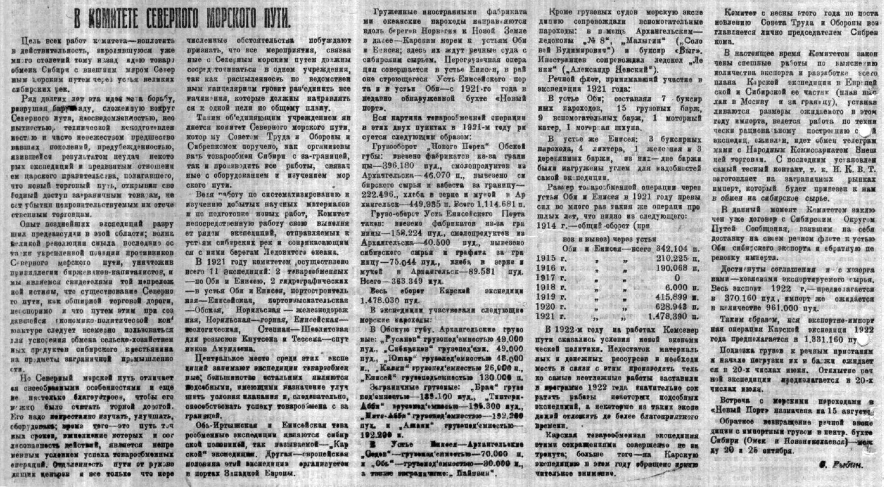 Работы Комитета Северного Морского Пути в 1921 г.Реорганизованный в 1920 г. Комитет Северного Морского Пути при Сибревкоме - объединяет в себе все отдельные работы и научные исследования на Севере, имеющие непосредственное отношение к делу установления правильного товарообмена Сибири с Западной Европой и Америкой через Северный Ледовитый Океан, и практически осуществляет указанный товарообмен.