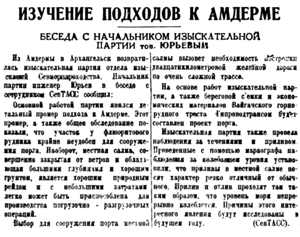 Из Амдермы в Архангельск возвратилась изыскательная партия отдела изысканий Севморпароходства. Начальник партии инженер Юрьев в беседе с сотрудником СевТАСС сообщил: