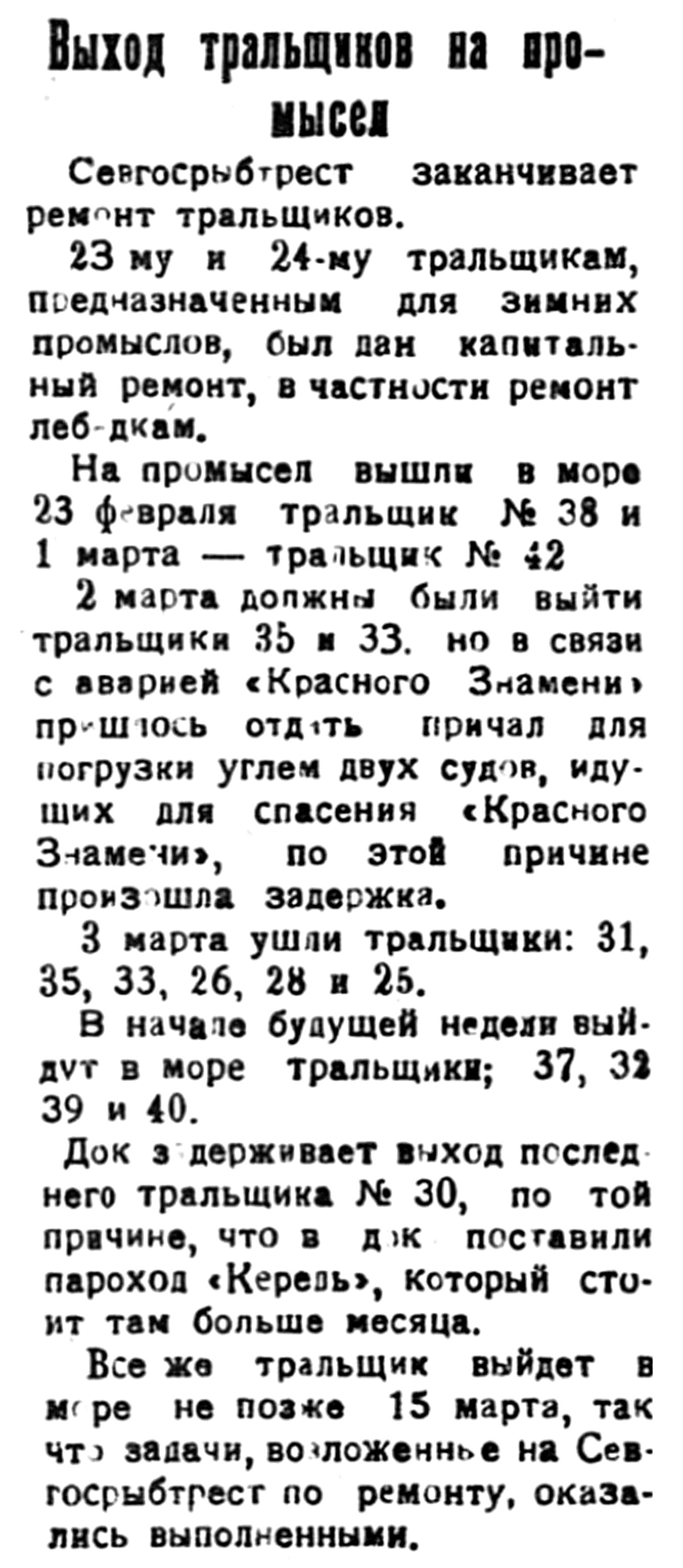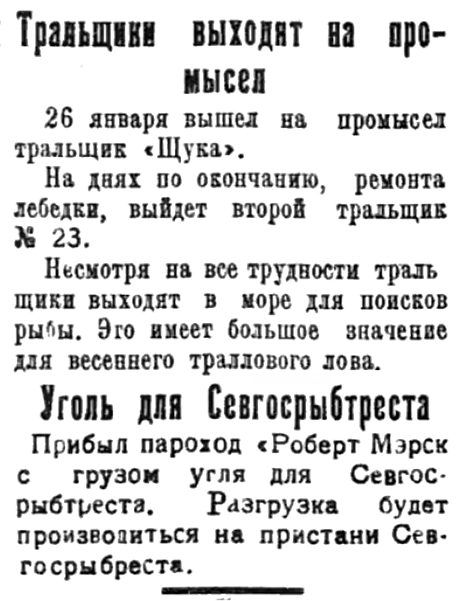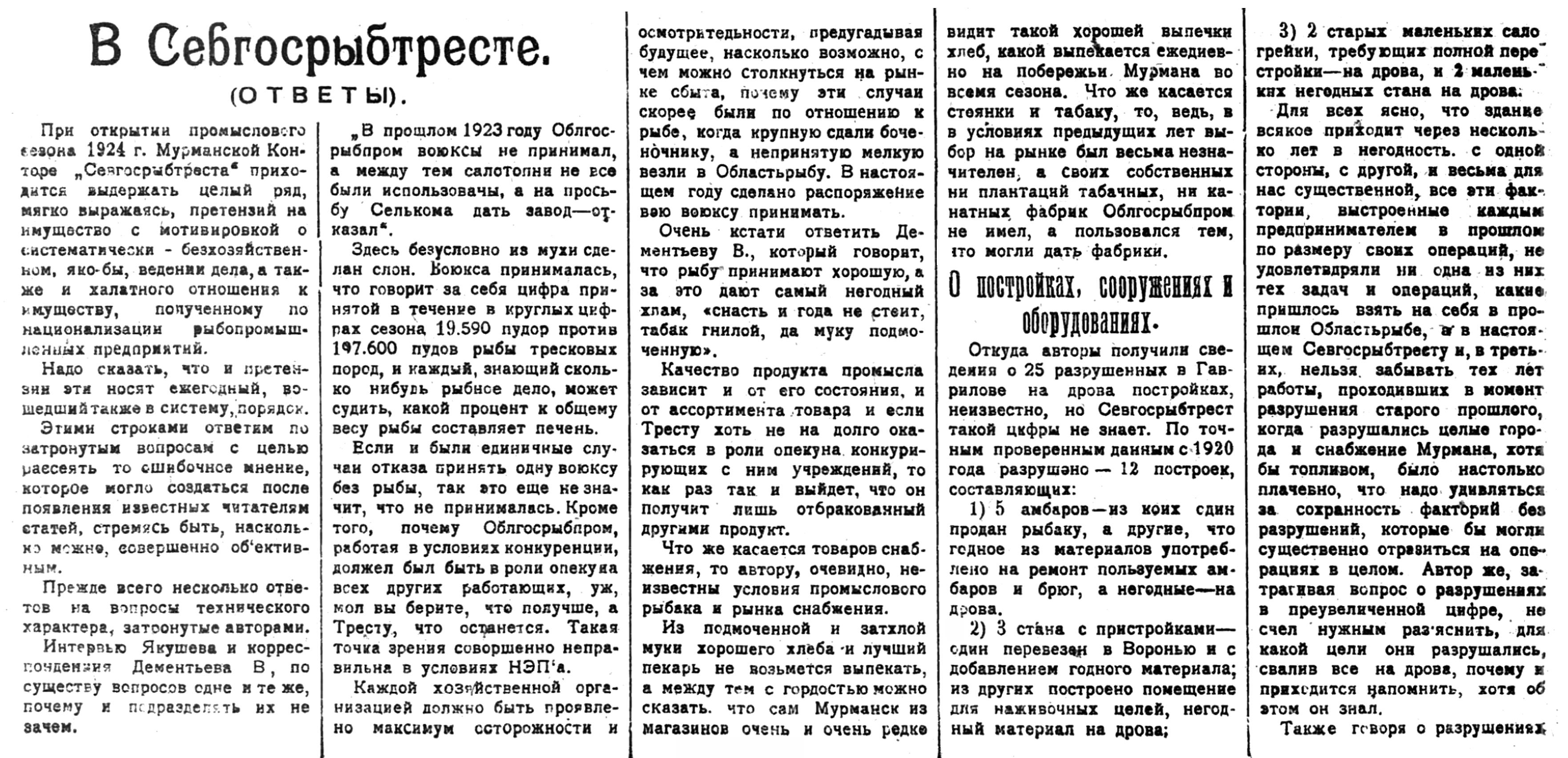 При открытии промыслового сезона 1924 г. Мурманской Конторе "Севгосрыбтреста" приходится выдержать целый ряд, мягко выражаясь, претензий на имущество с мотивировкой о систематически-бесхозяйственном, яко-бы, ведении дела, а также и халатного отношения к имуществу, полученному по национализации рыбопромышленных предприятий.