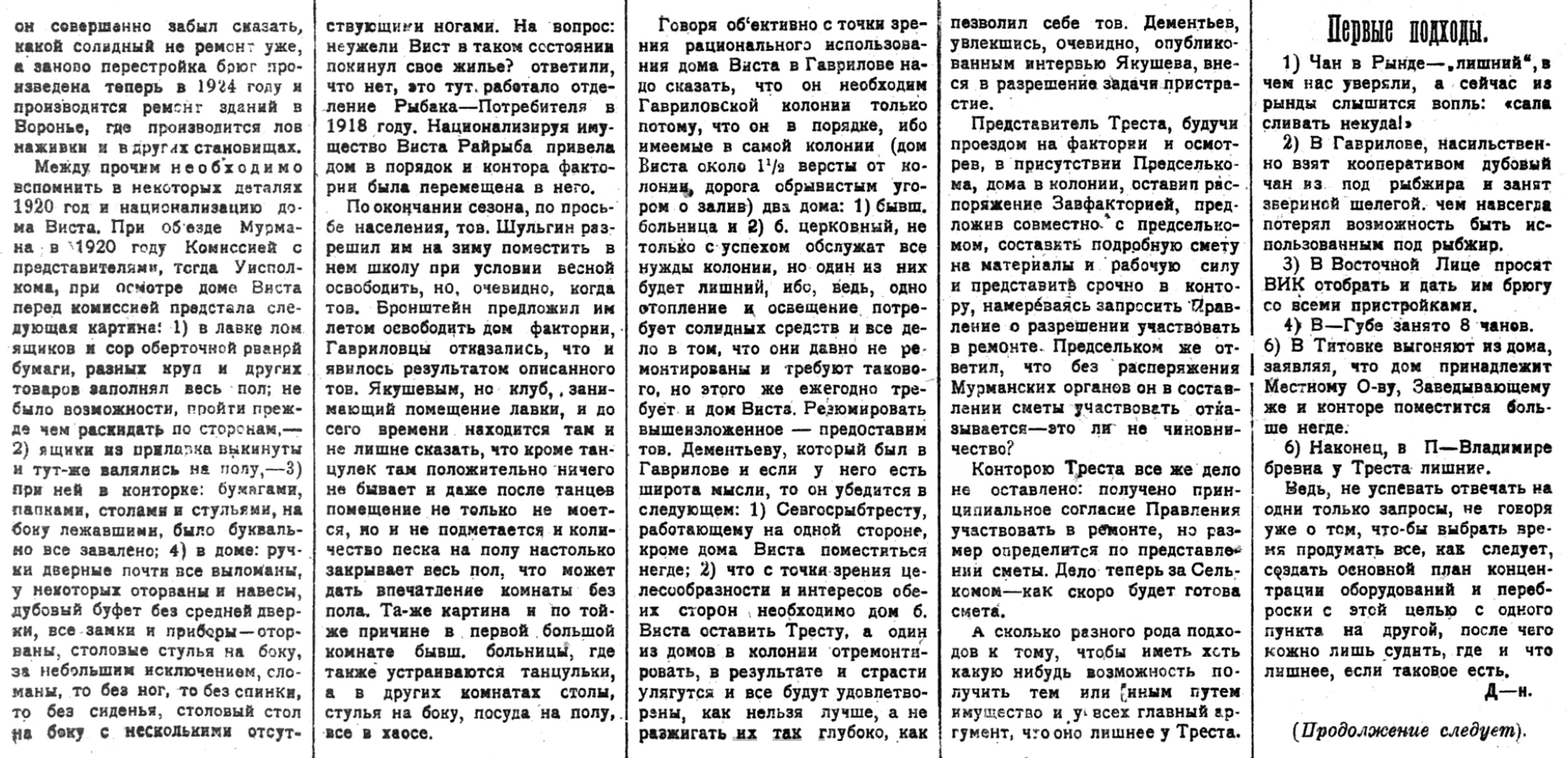 Представитель Треста, будучи проездом на фактории и осмотрев, в присутствии Предселькома, дома в колонии, оставил распоряжение Завфакторией, предложив совместно с предселькомом, составить подробную смету на материалы и рабочую силу и представить срочно в контору, намереваясь запросить Правление о разрешении участвовать в ремонте. Предсельком же ответил, что без распоряжения Мурманских органов он в составлении сметы участвовать отказывается — это ли не чиновничество?