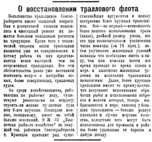 Каждой хозяйственной организацией должно быть проявлено максимум осторожности и осмотрительности, предугадывая будущее, насколько возможно, с чем можно столкнуться на рынке сбыта, почему эти случаи скорее были по отношению к рыбе, когда крупную сдали боченочнику, а непринятую мелкую везли в Областьрыбу. В настоящем году сделано распоряжение всю воюксу принимать.