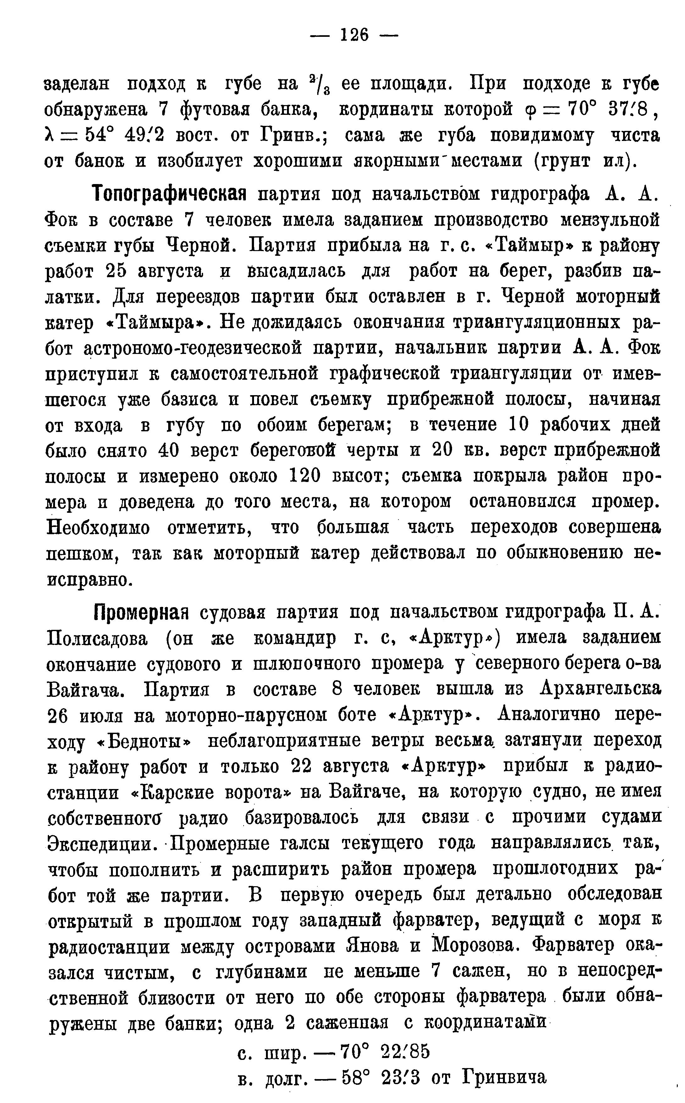 Топографическая партия под начальством гидрографа А. А. Фок в составе 7 человек имела заданием производство мензульной съемки губы Черной. Партия прибыла на г. с. "Таймыр" к району работ 25 августа и высадилась для работ на берег, разбив палатки. Для переездов партии был оставлен в г. Черной моторный катер "Таймыра*. Не дожидаясь окончания триангуляционных работ астрономо-геодезической партии, начальник партии А. А. Фок приступил к самостоятельной графической триангуляции от имевшегося уже базиса и повел съемку прибрежной полосы, начиная от входа в губу по обоим берегам; в течение 10 рабочих дней было снято 40 верст береговой черты и 20 кв. верст прибрежной полосы и измерено около 120 высот; съемка покрыла район промера и доведена до того места, на котором остановился промер. Необходимо отметить, что большая часть переходов совершена пешком, так как моторный катер действовал по обыкновению неисправно.