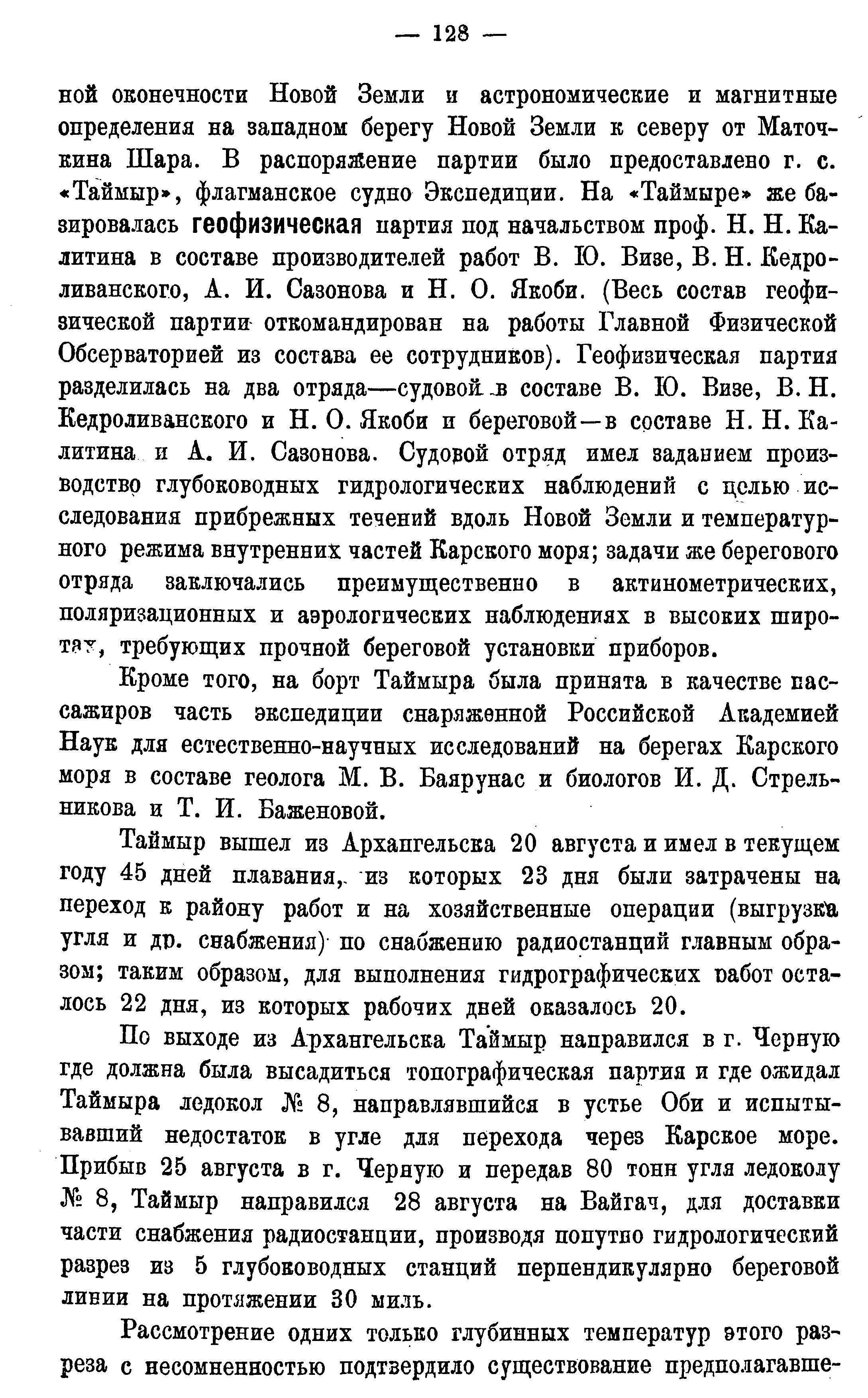 ной оконечности Новой Земли и астрономические и магнитные определения на западном берегу Новой Земли к северу от Маточкина Шара. В распоряжение партии было предоставлено г. с. "Таймыр", флагманское судно Экспедиции. На "Таймыре" же базировалась геофизическая партия под начальством проф. Н. Н. Калитина в составе производителей работ В. Ю. Визе, В. Н. Кедроливанского, А. И. Сазонова и Н. О. Якоби. (Весь состав геофизической партии откомандирован на работы Главной Физической Обсерваторией из состава ее сотрудников). Геофизическая партия разделилась на два отряда — судовой: в составе В. Ю. Визе, В. Н. Кедроливанского и Н. О. Якоби и береговой — в составе Н. Н. Калитина и А. И. Сазонова. Судовой отряд имел заданием производство глубоководных гидрологических наблюдений с целью исследования прибрежных течений вдоль Новой Земли и температурного режима внутренних частей Карского моря; задачи же берегового отряда заключались преимущественно в актинометрических, поляризационных и аэрологических наблюдениях в высоких широтах, требующих прочной береговой установки приборов.