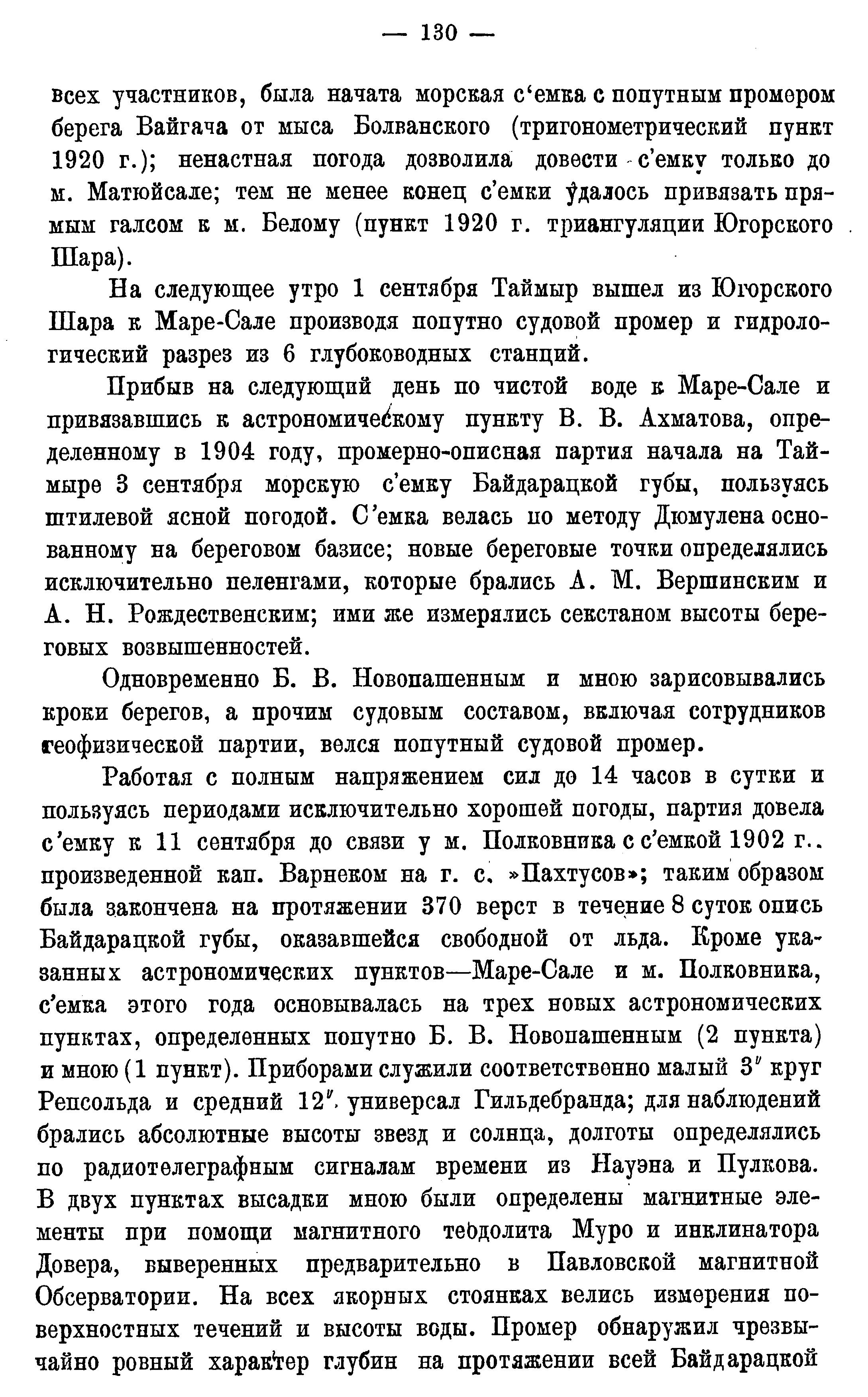 Работая с полным напряжением сил до 14 часов в сутки и пользуясь периодами исключительно хорошей погоды, партия довела съемку к 11 сентября до связи у м. Полковника с съемкой 1902 г., произведенной кап. Варнеком на г. с, "Пахтусов"; таким образом была закончена на протяжении 370 верст в течение 8 суток опись Байдарацкой губы, оказавшейся свободной от льда. Кроме указанных астрономических пунктов — Маре-Сале и м. Полковника, съемка этого года основывалась на трех новых астрономических пунктах, определенных попутно Б. В. Новопашенным (2 пункта) и мною (1 пункт). Приборами служили соответственно малый 3" круг Репсольда и средний 12" универсал Гильдебранда; для наблюдений брались абсолютные высоты звезд и солнца, долготы определялись по радиотелеграфным сигналам времени из Науэна и Пулкова.