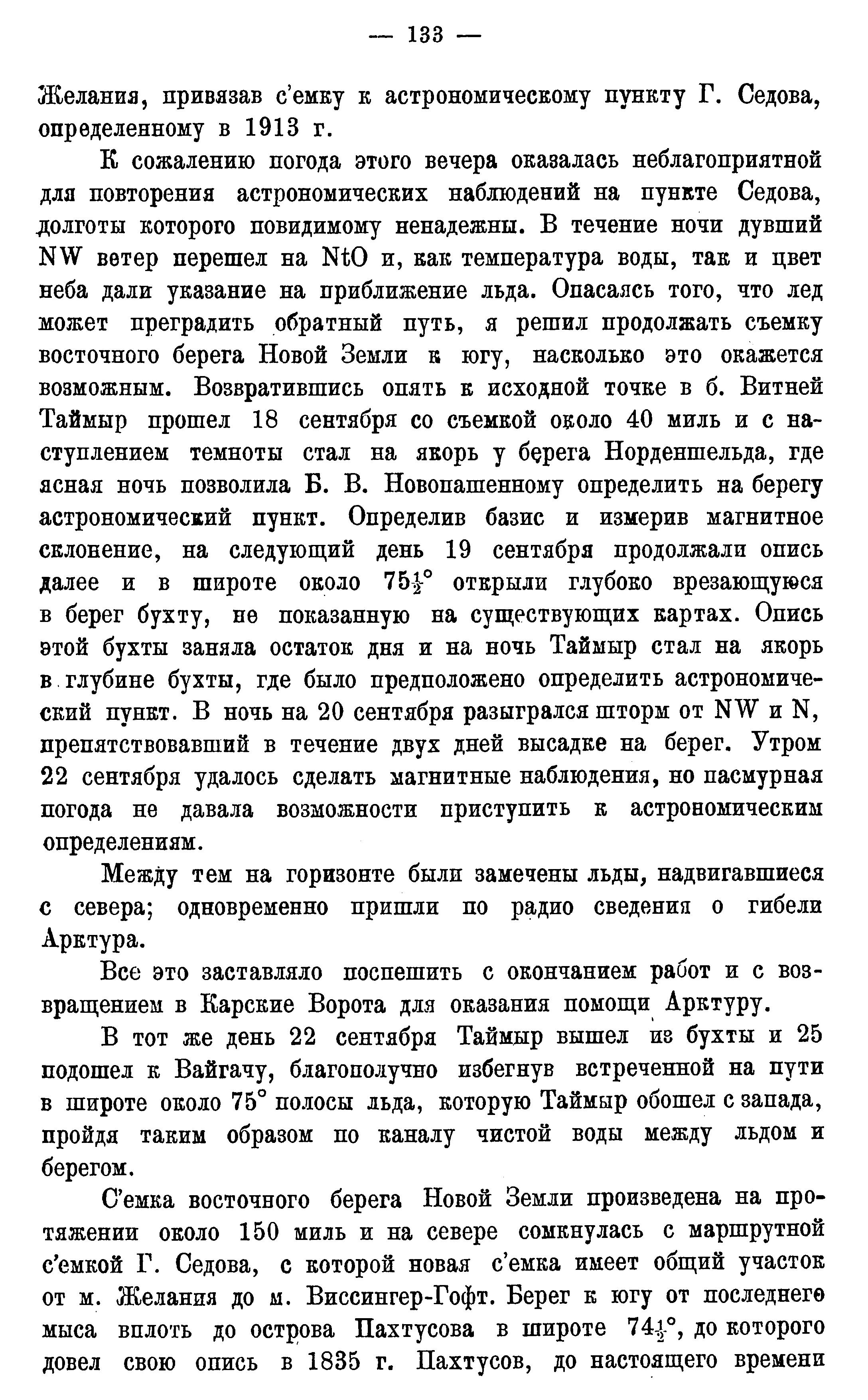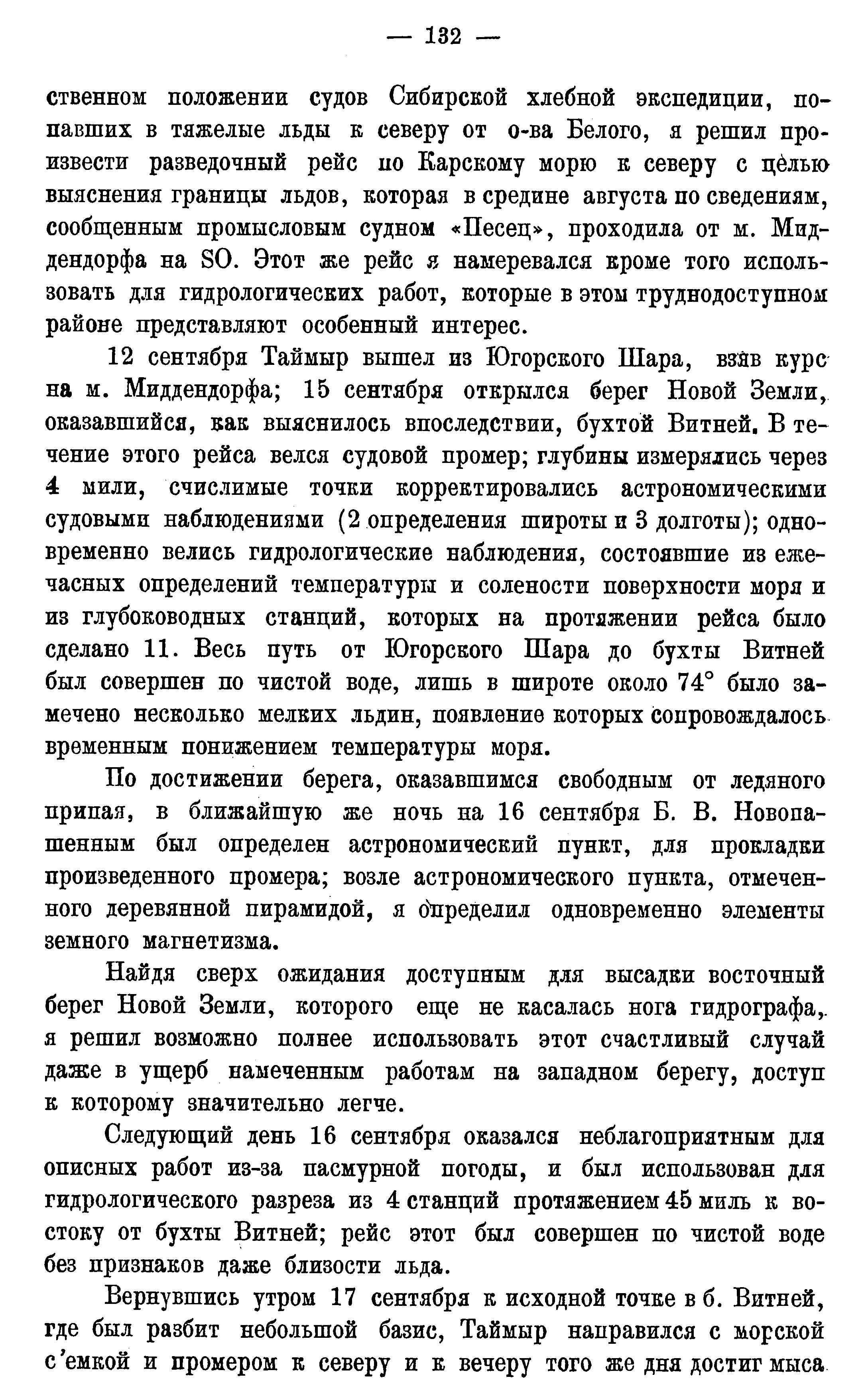 К сожалению погода этого вечера оказалась неблагоприятной для повторения астрономических наблюдений на пункте Седова, долготы которого повидимому ненадежны. В течение ночи дувший NW ветер перешел на и, как температура воды, так и цвет неба дали указание на приближение льда. Опасаясь того, что лед может преградить обратный путь, я решил продолжать съемку восточного берега Новой Земли к югу, насколько это окажется возможным. Возвратившись опять к исходной точке в б. Витней Таймыр прошел 18 сентября со съемкой около 40 миль и с наступлением темноты стал на якорь у берега Норденшельда, где ясная ночь позволила Б. В. Новопашенному определить на берегу астрономический пункт. Определив базис и измерив магнитное склонение, на следующий день 19 сентября продолжали опись далее и в широте около 75 1/2° открыли глубоко врезающуюся в берег бухту, не показанную на существующих картах. Опись этой бухты заняла остаток дня и на ночь Таймыр стал на якорь в глубине бухты, где было предположено определить астрономический пункт. В ночь на 20 сентября разыгрался шторм от NW и N, препятствовавший в течение двух дней высадке на берег. Утром