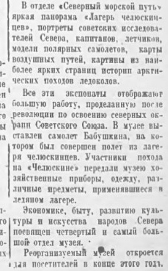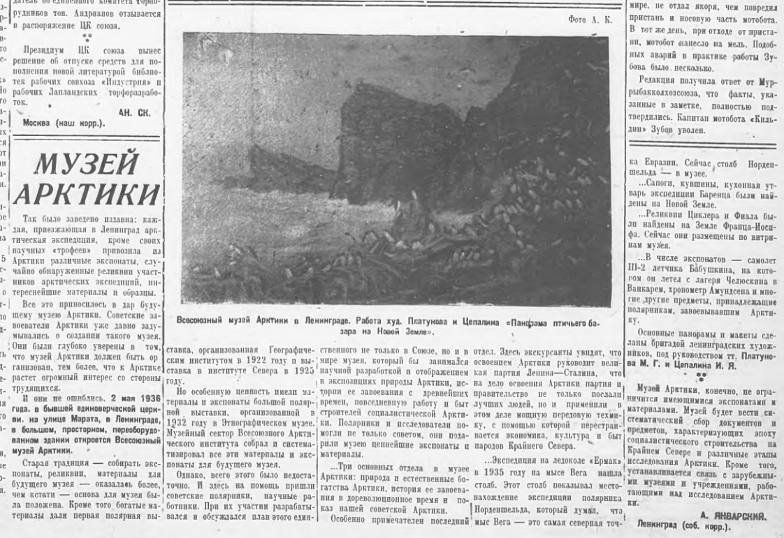 Арктический институт приступил к организации Музея Арктики в Ленинграде. Намечены отделы: физико-географический, Ледовитого моря, деятельности человека в Арктике, использования ее производительных сил, а также исторический. Музей уже располагает довольно значительным количеством экспонатов, часть которых представляет большую ценность как уники; имеется много картин Арктики. Временно, до получения соответствующего помещения, музей будет функционировать в виде полярного отдела существующего Географического музея.