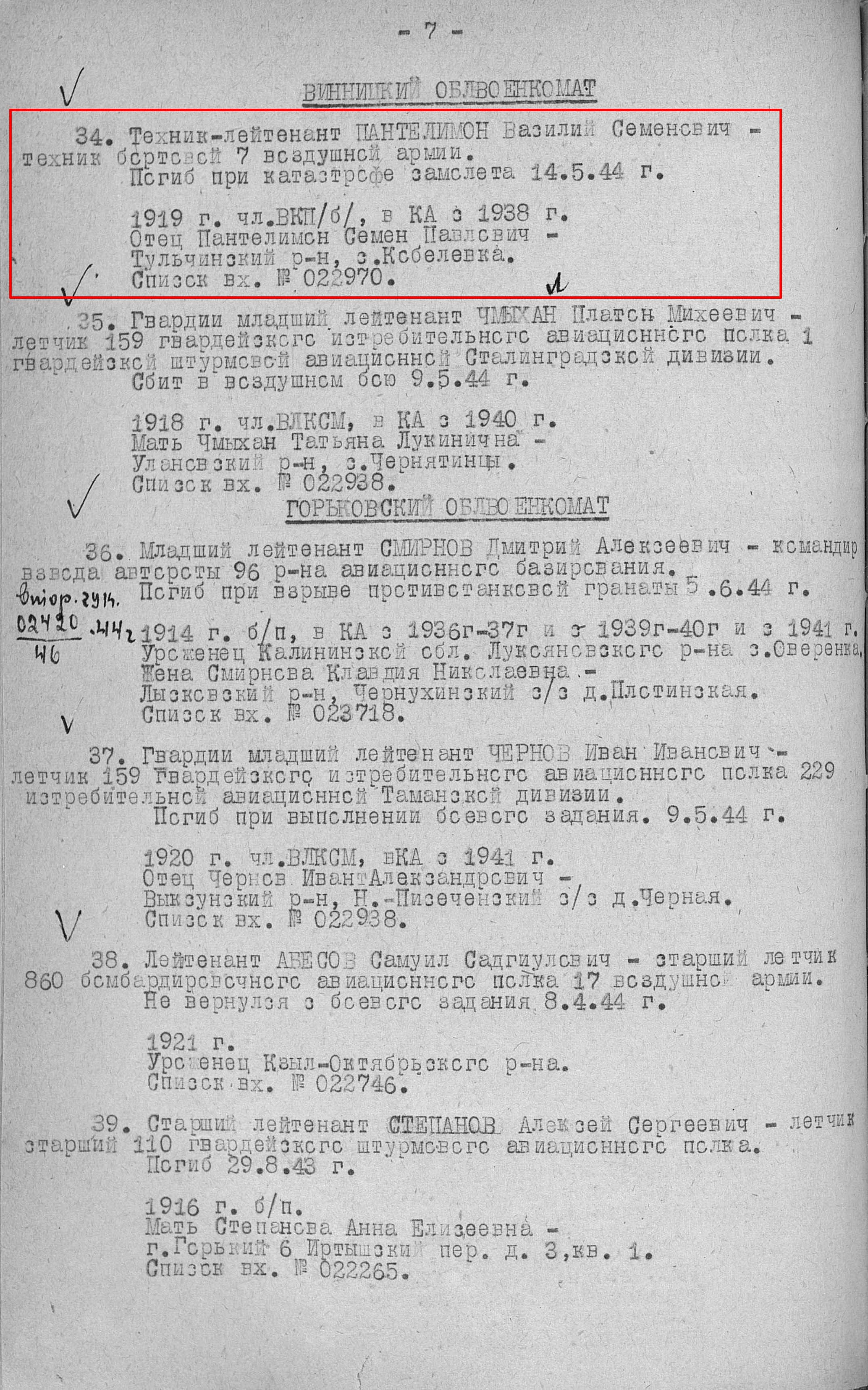 Приказ об исключении из списков №02220 13.07.1944 ГУК НКО