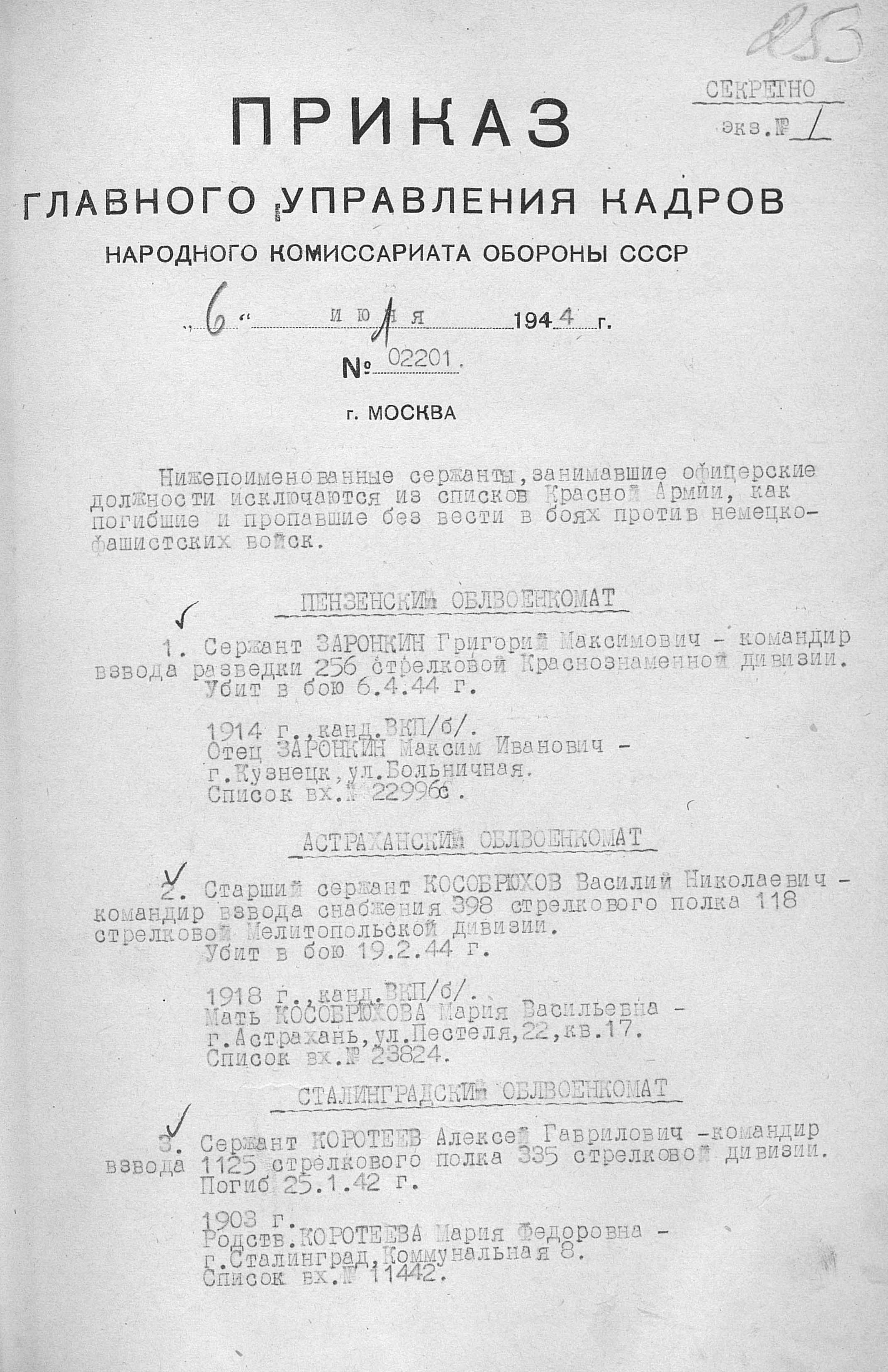 Приказ об исключении из списков №02201 06.07.1944 ГУК НКО