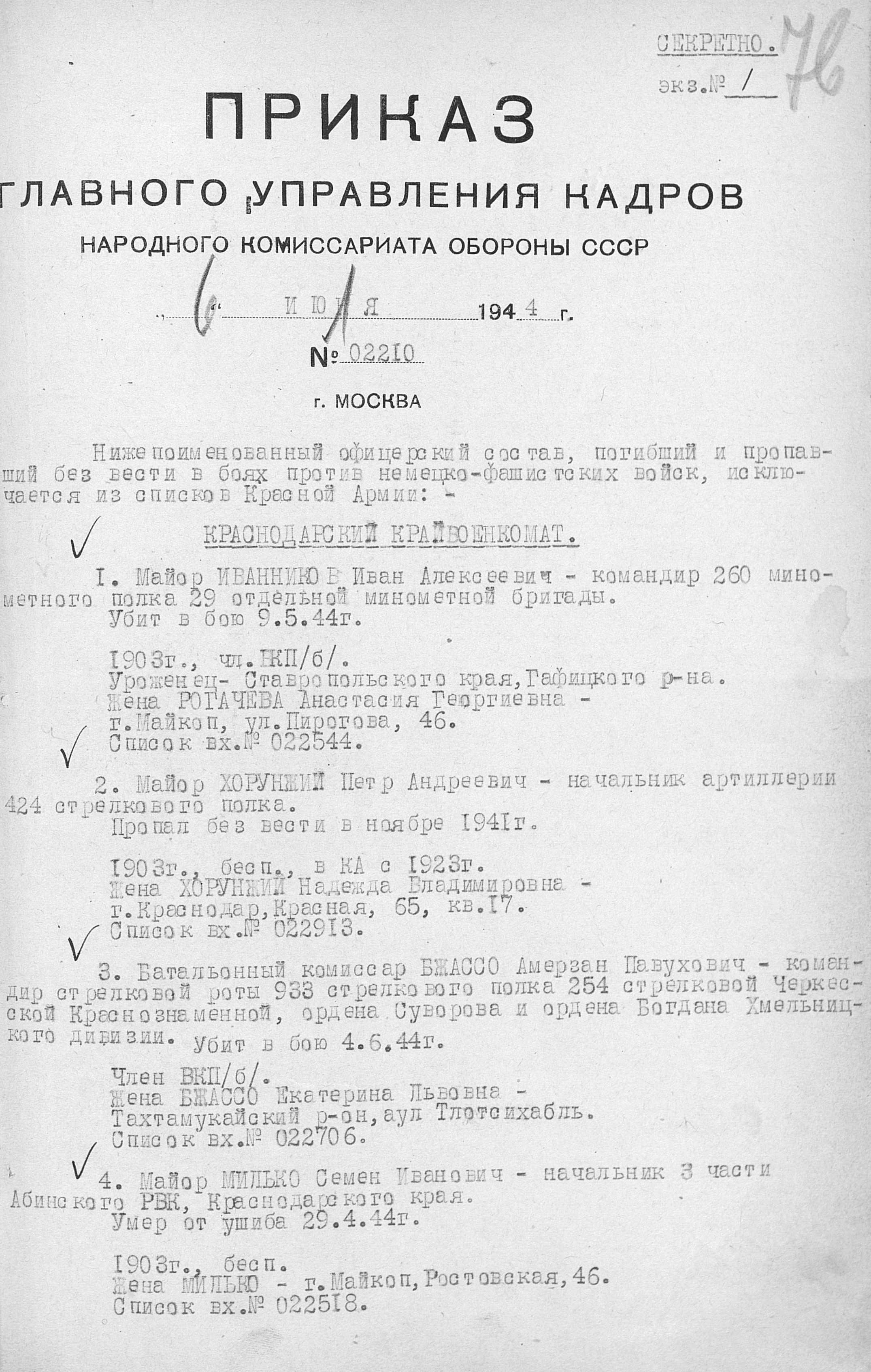 Приказ об исключении из списков №02210 06.07.1944 ГУК НКО