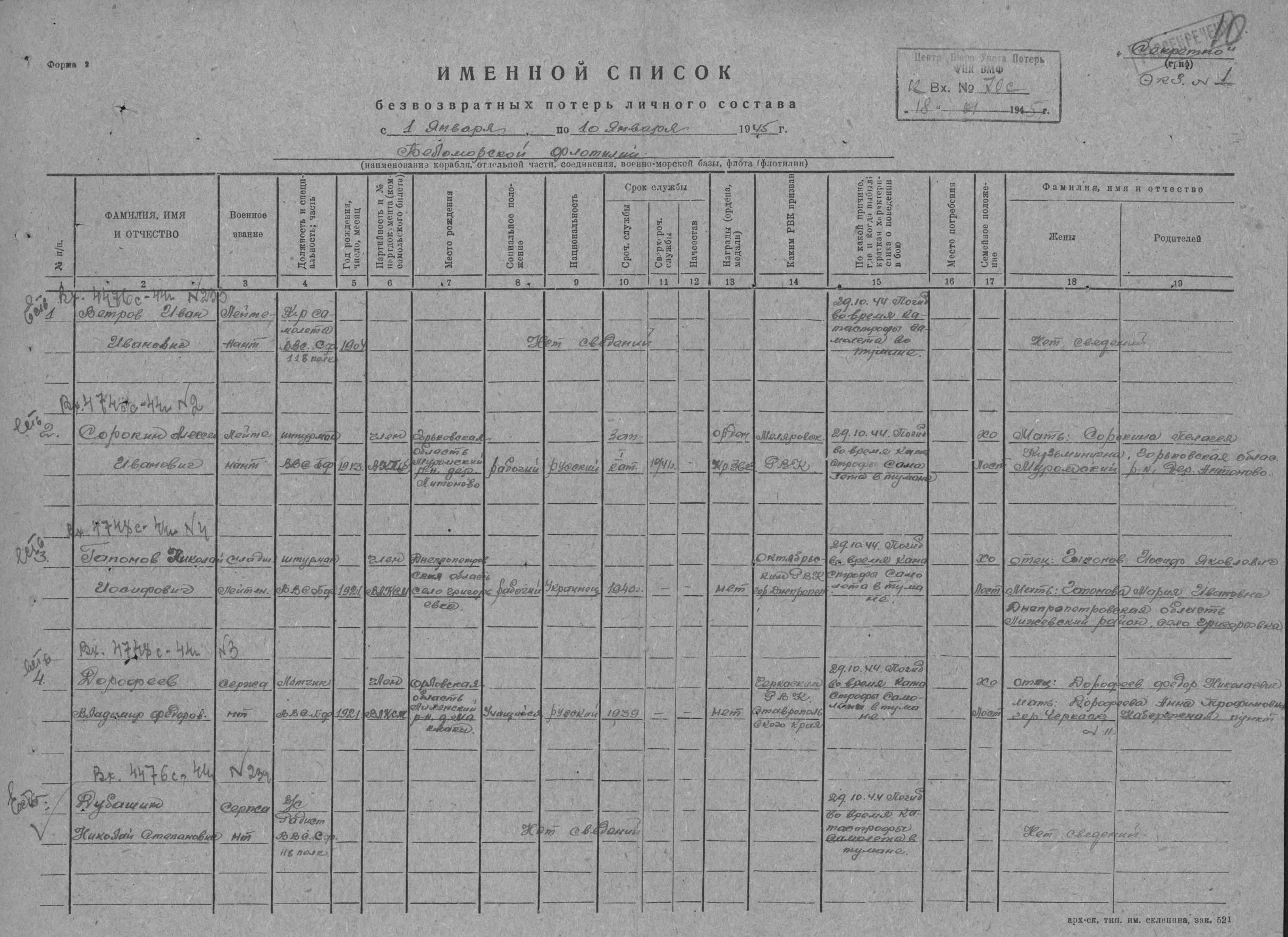 3. Штурман, лейтенант Сорокин Алексей Иванович, родился 9 августа 1913 г., в д. Антипово, Муромского района, Горьковской области. Русский, из рабочих. Член компартии с 1942 года.