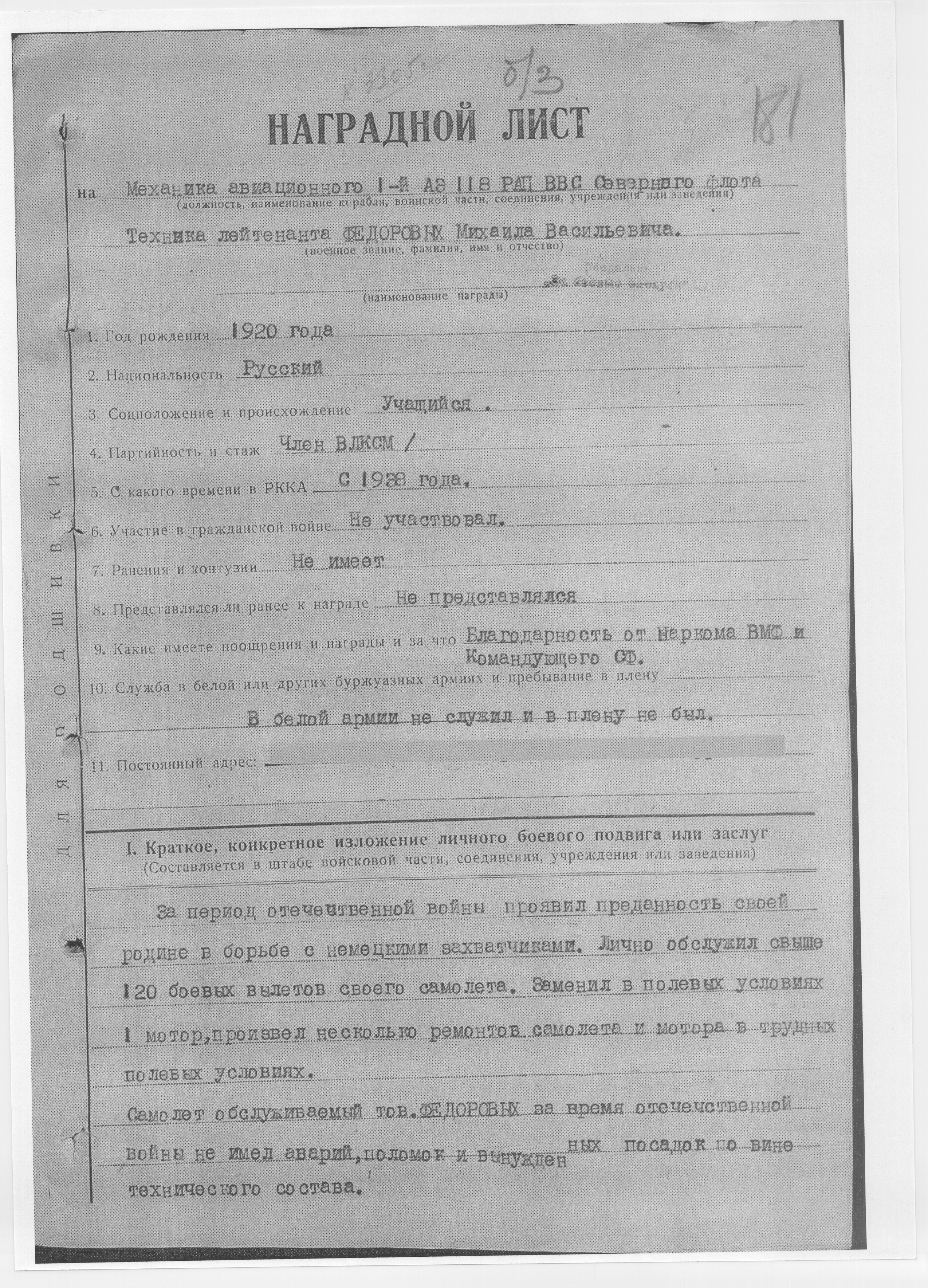 В 1943 г., выполнял боевую работу с оперативных аэродромов Иоганки, Моржовец, Нарьян-Мар и Амдерма в сложных метеоусловиях Севера. Имеет в общей сложности 44 боевых вылетов на ледовую разведку, поиск НЛ, ПЛ и мин противника на сопровождение конвоев.
