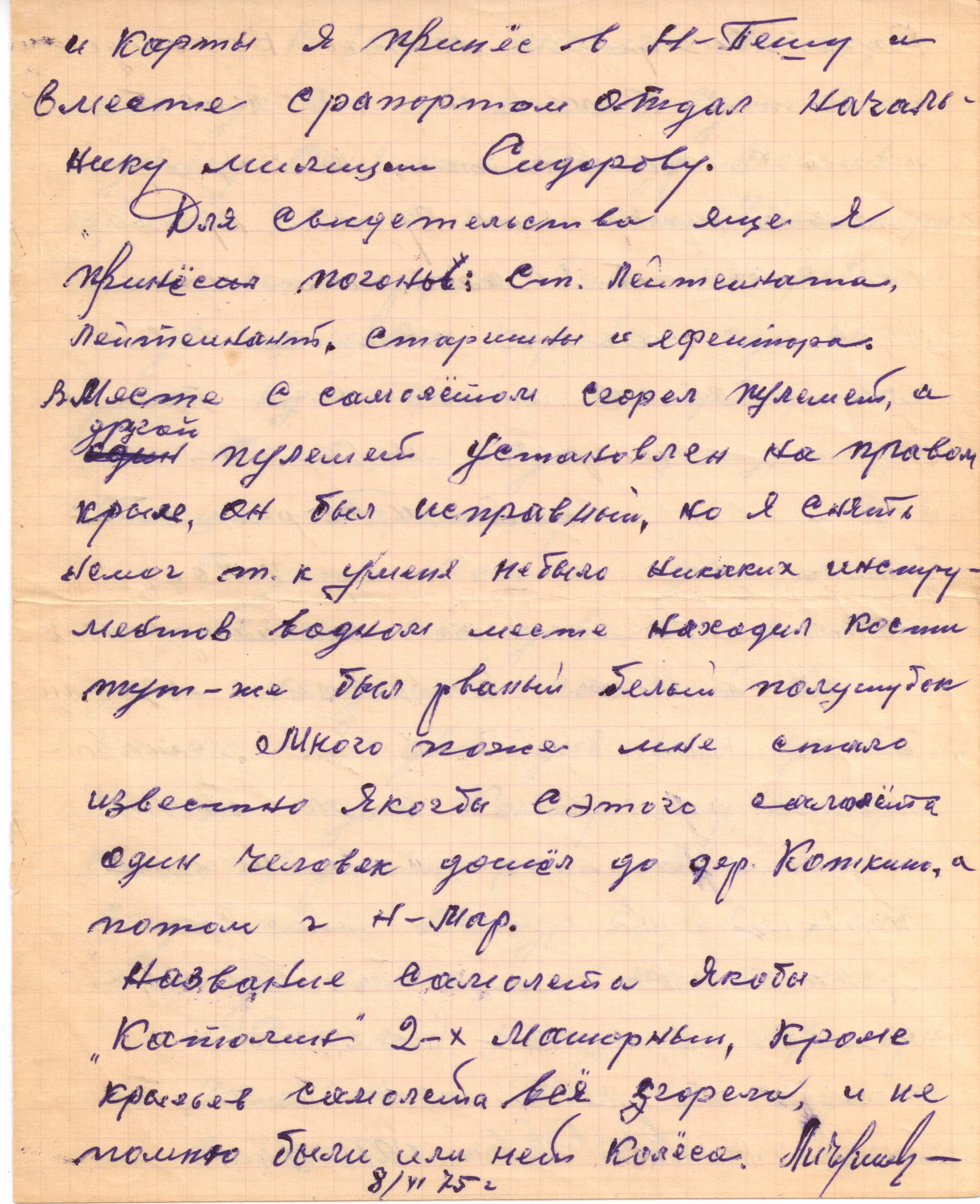Как самолет ударился в землю и остались крылья. Тут оставались карты, вещи, но они были собраны оленеводами, когда нашли первые. Когда исследовал самолет я нашел Конспек (?) и билет погоревший, на имя Брагина, но не помню – комсомольский или партийный был билет. Все найденные документы и карты я привез в Нижнюю-Пешу и вместе с рапортом отдал начальнику милиции Сидорову.
