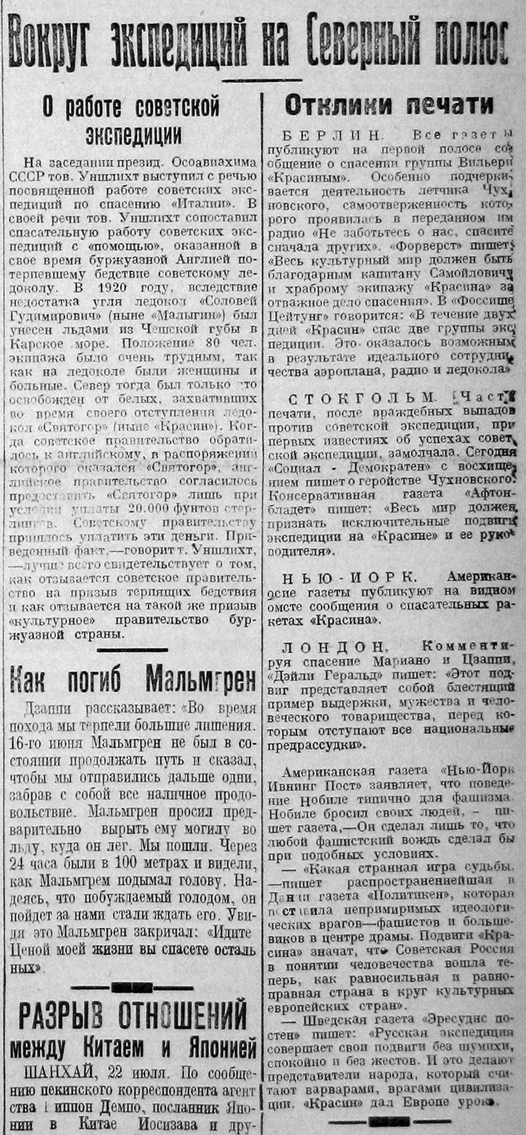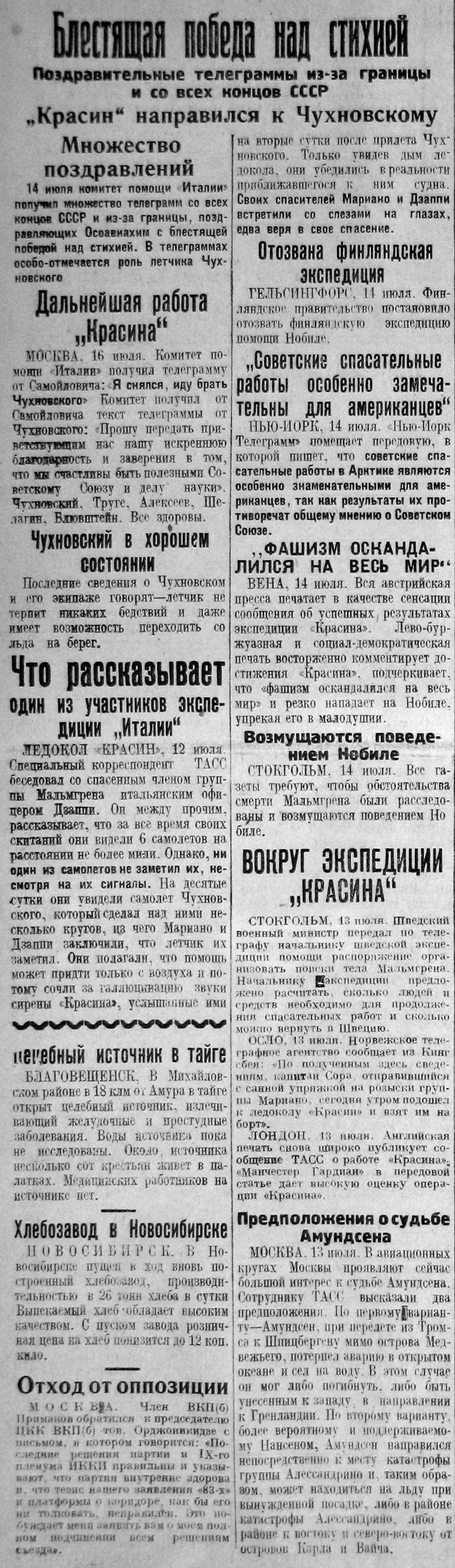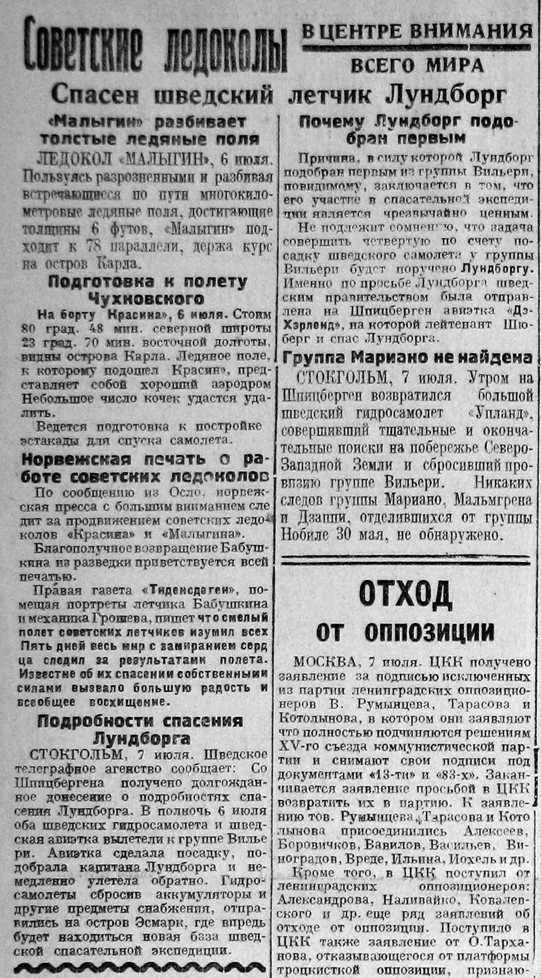 К 4 июля «Красин» находился в 120 клм от места катастрофы, что дает возможность Чухновскому свободно работать на своем оборудованном лыжами самолете.