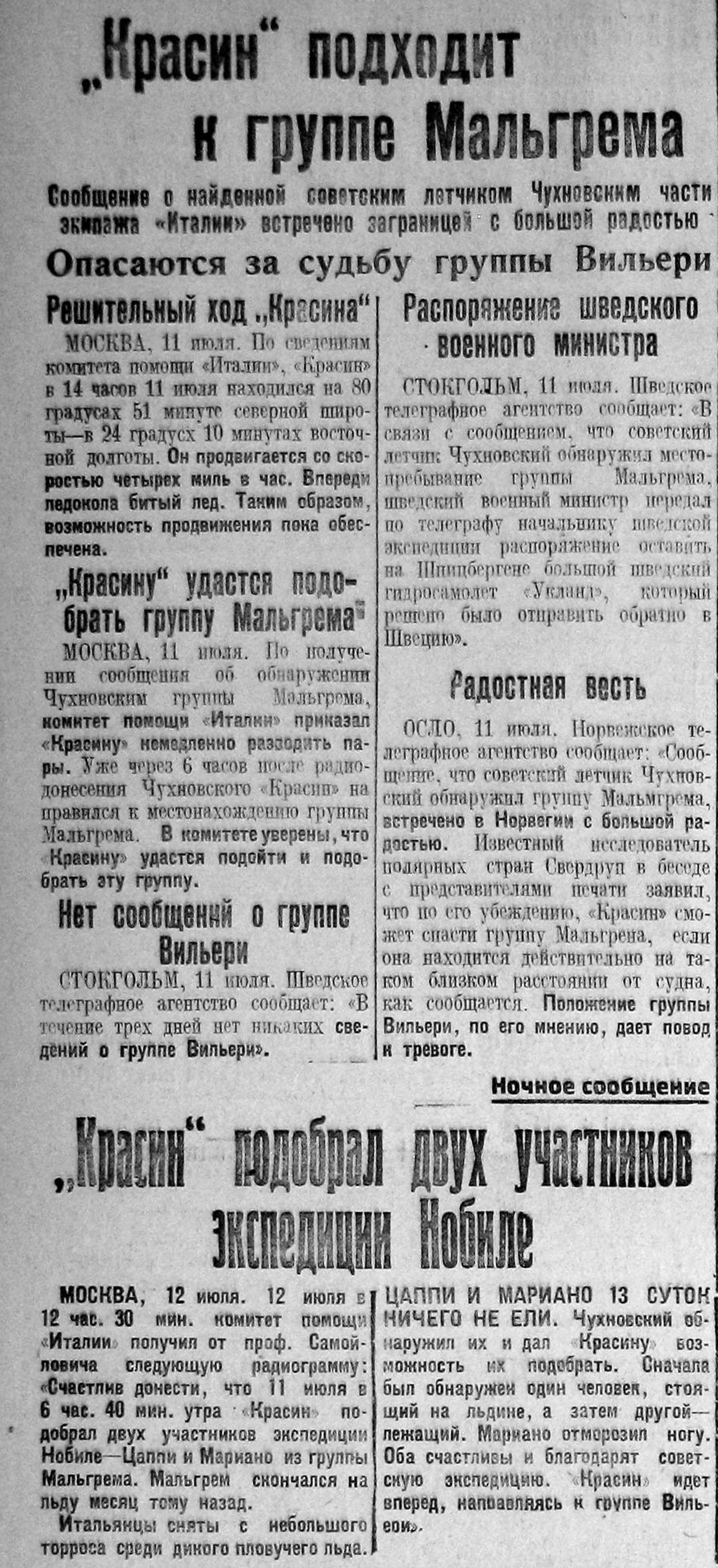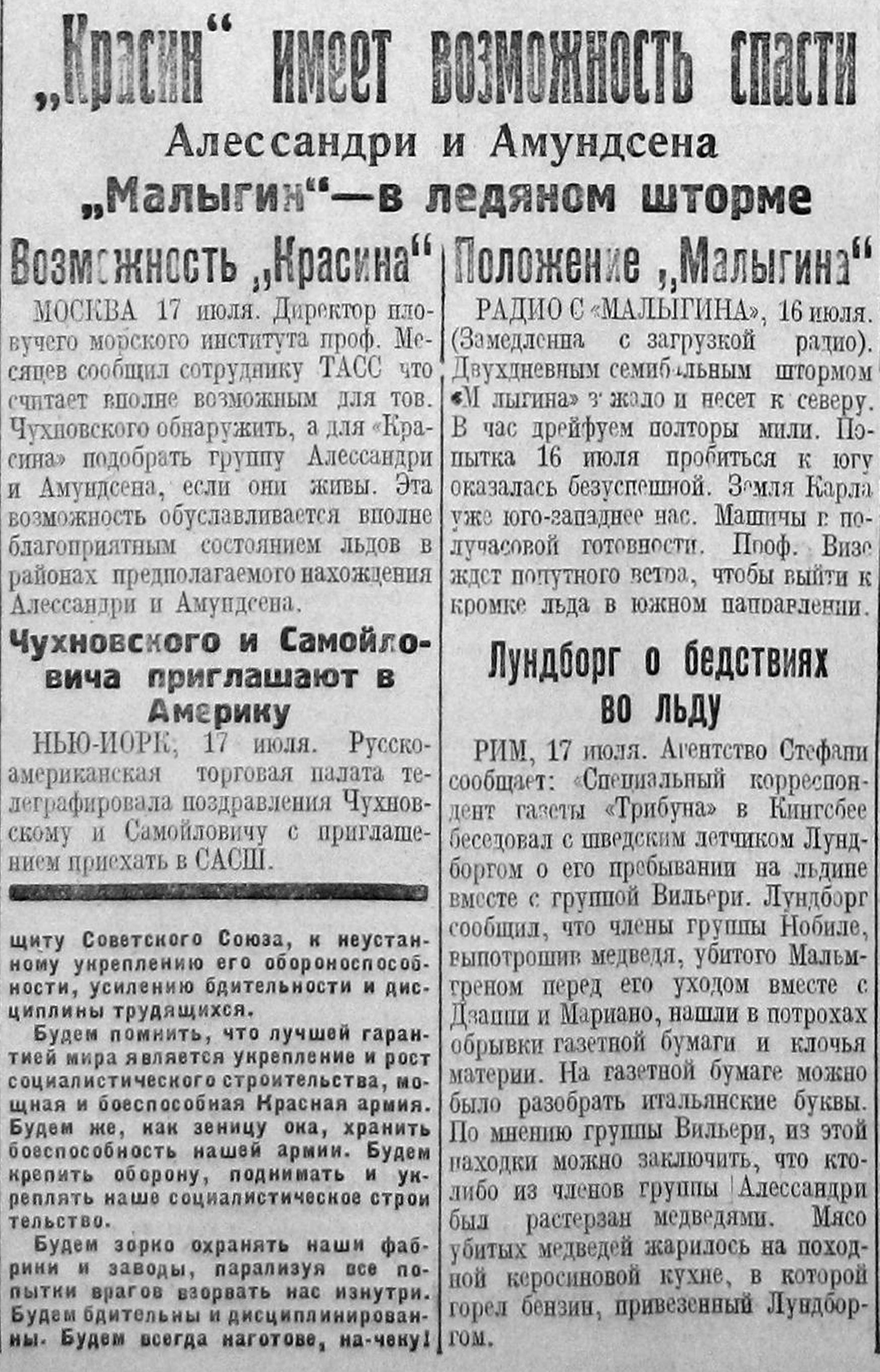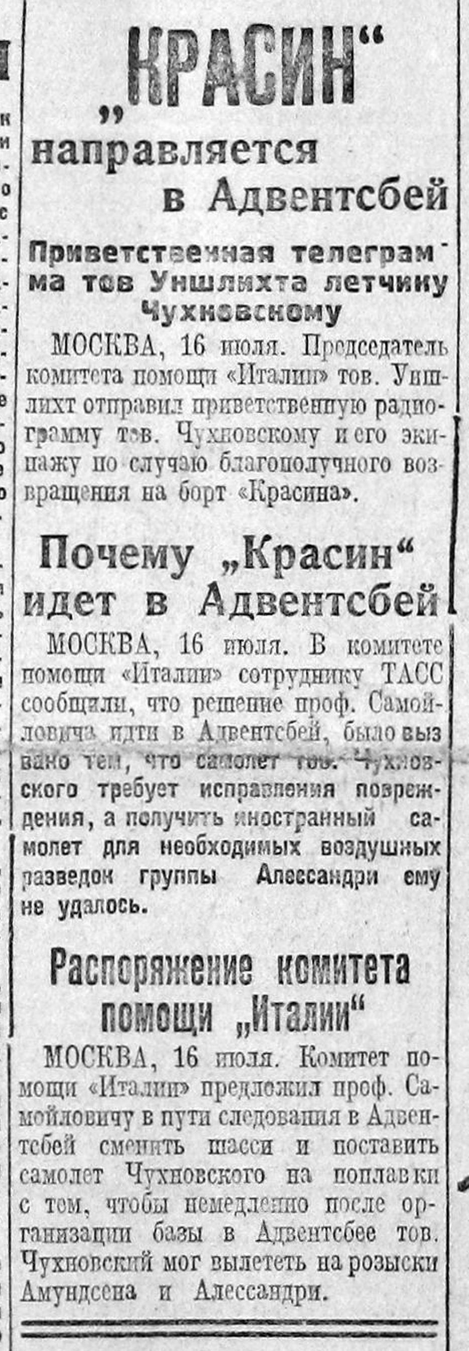 МОСКВА. В комитете помощи «Италии» сообщили, что теперь необходимо установить возможность продвижения «Красина» непосредственно к месту катастрофы или, если это исключается, применить самолет Чухновского для успешного завершения возложенных на западную экспедицию задач.