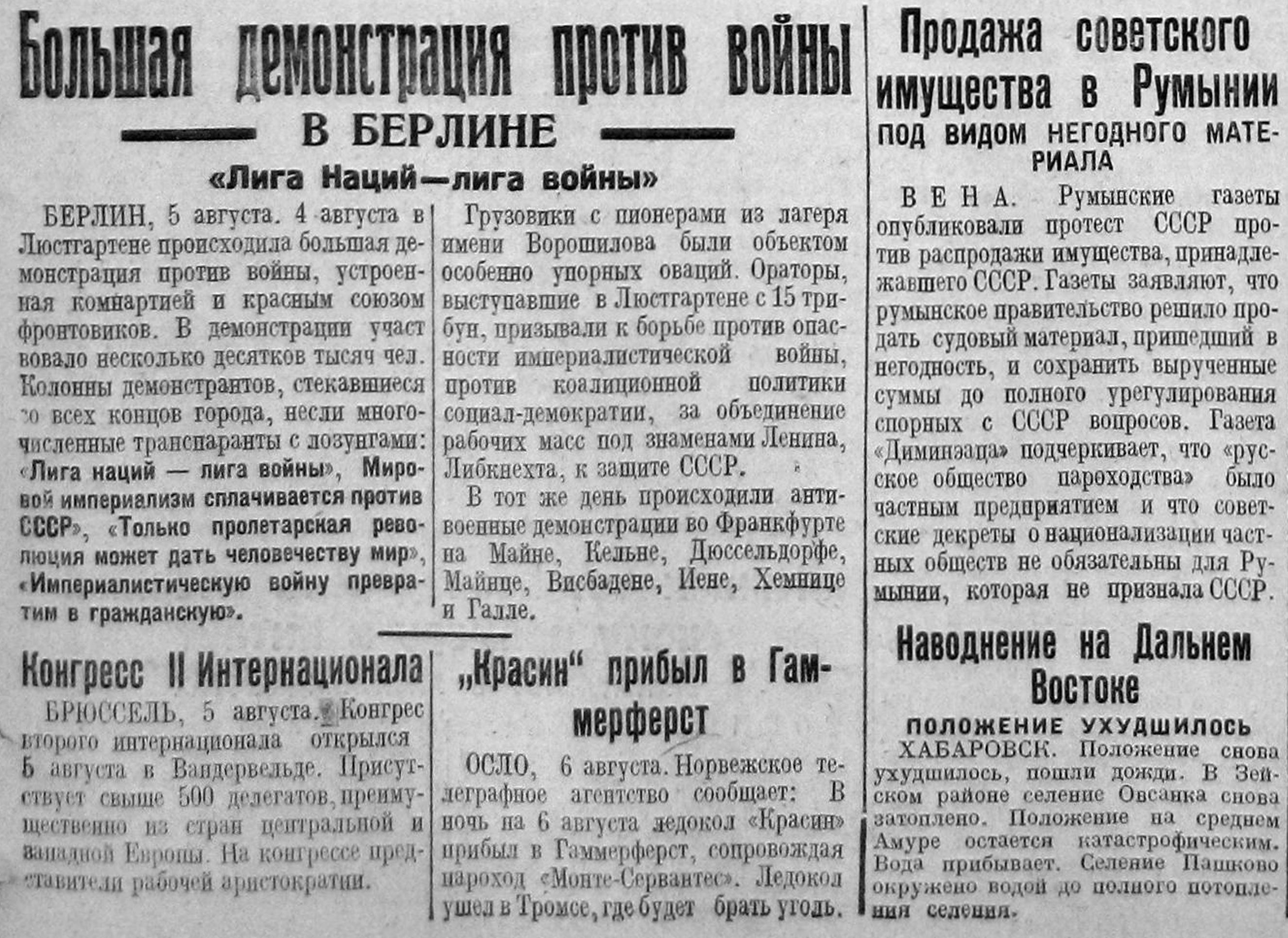 ОСЛО. 1 августа. Норвежское телеграфное агентство сообщает: «По прибытия "Красина" в Ставангер на всех муниципальных зданиях будут подняты флаги. Председатель муниципалитета и бургомистр отправятся