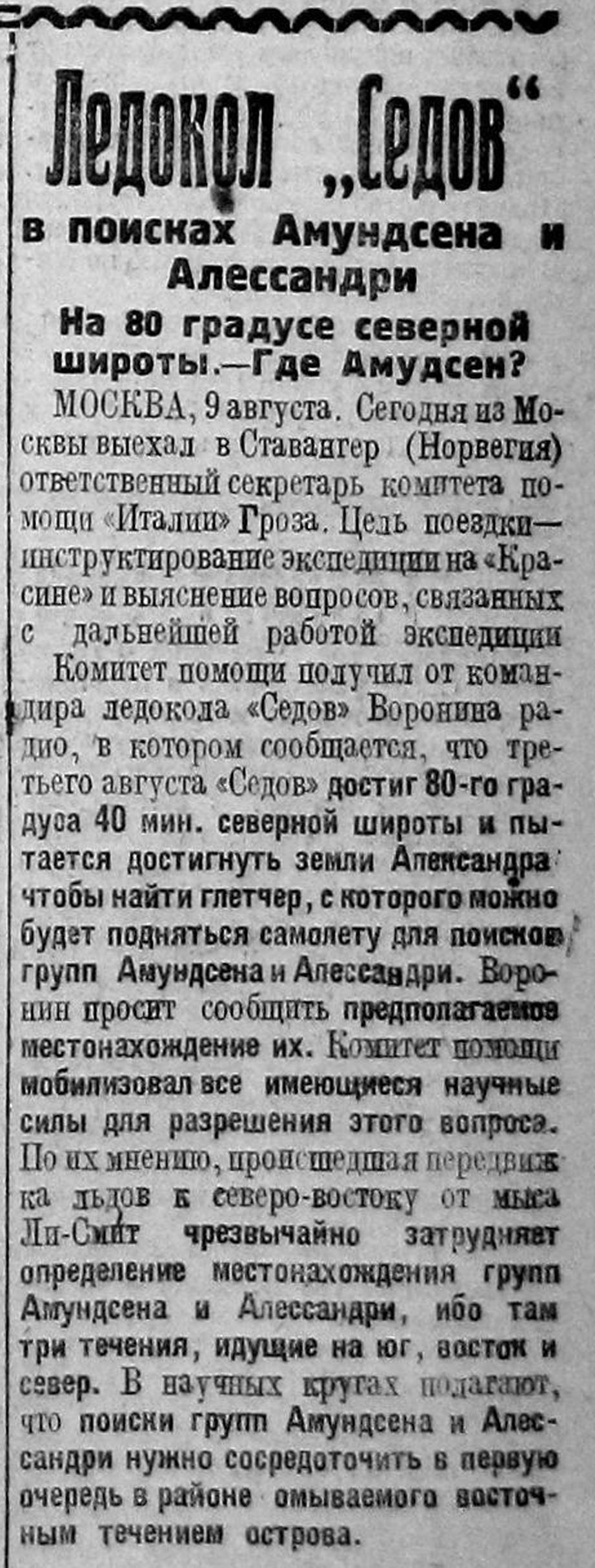 МОСКВА, 9 августа. Сегодня из Москвы выехал в Ставангер (Норвегия) ответственный секретарь комитета помощи «Италии» Гроза. Цель поездки — инструктирование экспедиции на «Красине» и выяснение вопросов, связанных с дальнейшей работой экспедиции. Комитет помощи получил от командира ледокола «Седов» Воронина радио, в котором сообщается, что третьего августа «Седов» достиг 80-го градуса 40 мин. северной широты и пытается достигнуть земли Александра чтобы найти глетчер, с которого можно будет подняться самолету для поисков групп Амундсена и Алессандри. Воронин просит сообщить предполагаемое местонахождение их. Комитет помощи мобилизовал все имеющиеся научные силы для разрешения этого вопроса. По их мнению, происшедшая передвижка льдов к северо-востоку от мыса Ли-Смит чрезвычайно затрудняет определение местонахождения групп Амундсена и Алессандри, ибо там три течения, идущие на юг, восток и север. В научных кругах полагают, что поиски групп Амундсена и Алессандри нужно сосредоточить в первую очередь в районе омываемого восточным течением острова.