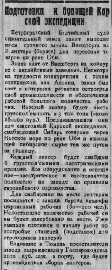 В организации вывоза леса по Карскому морскому пути положительную роль сыграло пополнение речного флота на реке Оби (на реке Енисее уже имелись железные лихтеры). По решению правительства, осенью 1923 г. на Балтийском судостроительном заводе в Петрограде для нужд Карских экспедиций были заложены два больших стальных лихтера, постройка которых закончилась следующей весной. Новые суда сооружались